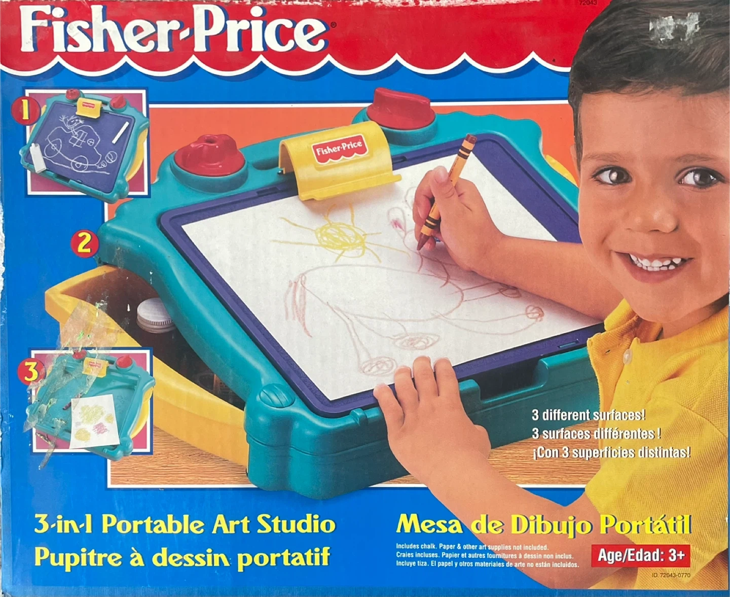 150This vintage 1996 Fisher-Price 3-in-1 Portable Art Studio is ready for a new generation of young artists! With three different surfaces for drawing, clip-in-place drawing surface, two large drawers for holding supplies and a built in handle. It's perfect for sparking creativity on the go. The condition is good, chalk and brushes are included. * 3 different surfaces for drawing * Clip to hold paper * Crayon sharpener * Two large drawers for storing art supplies * Easy carry handle Based on similar listings, I'm pricing it at $90 Used but like new If you're reading this, the art studio is still available! Get ready to unleash your child's inner Picasso!