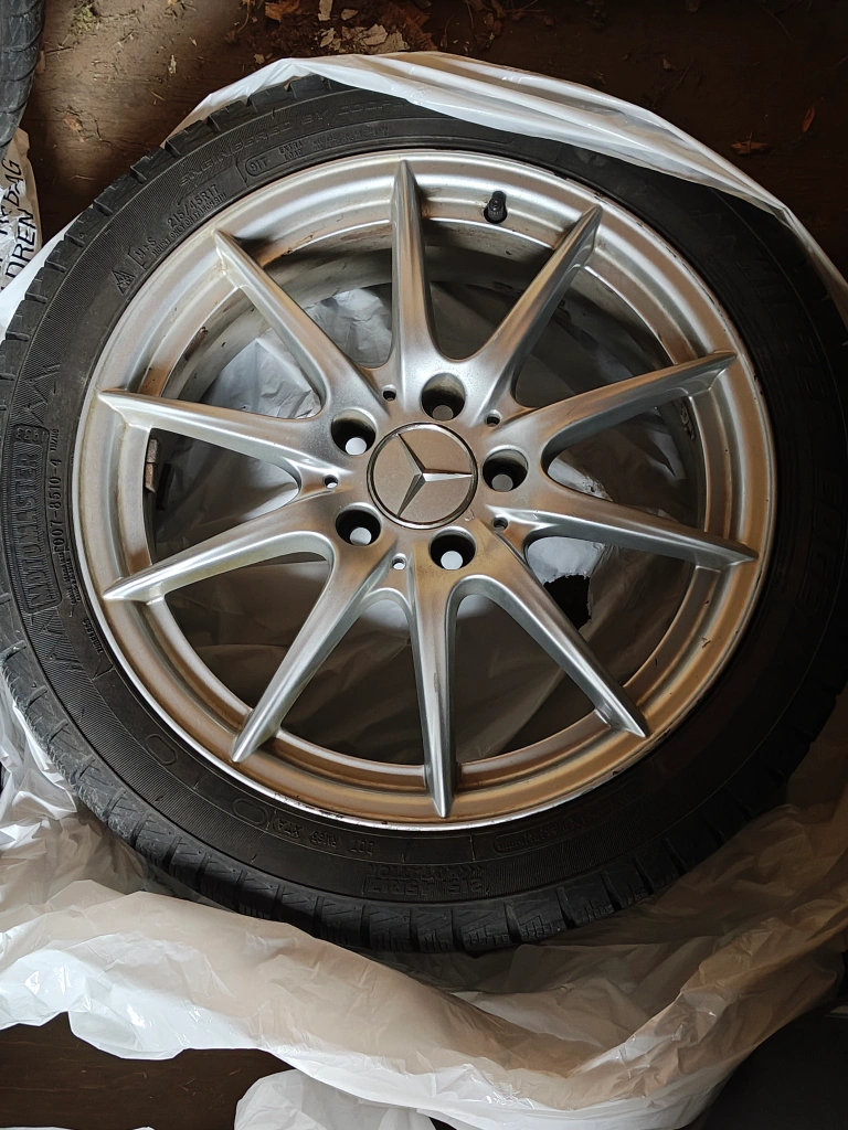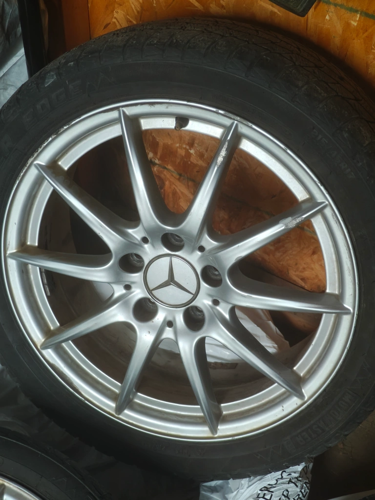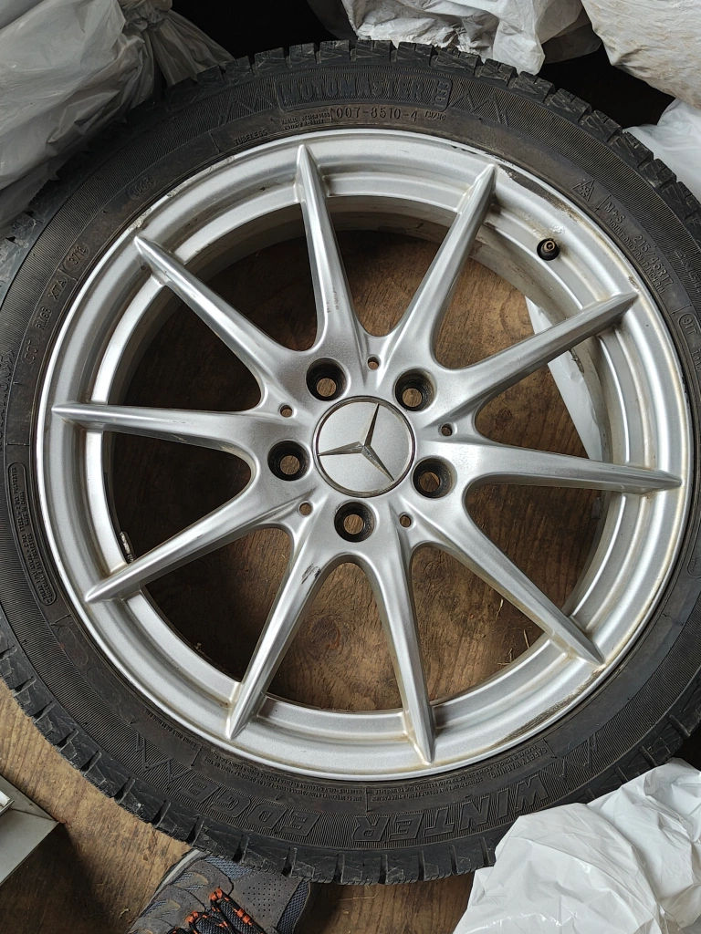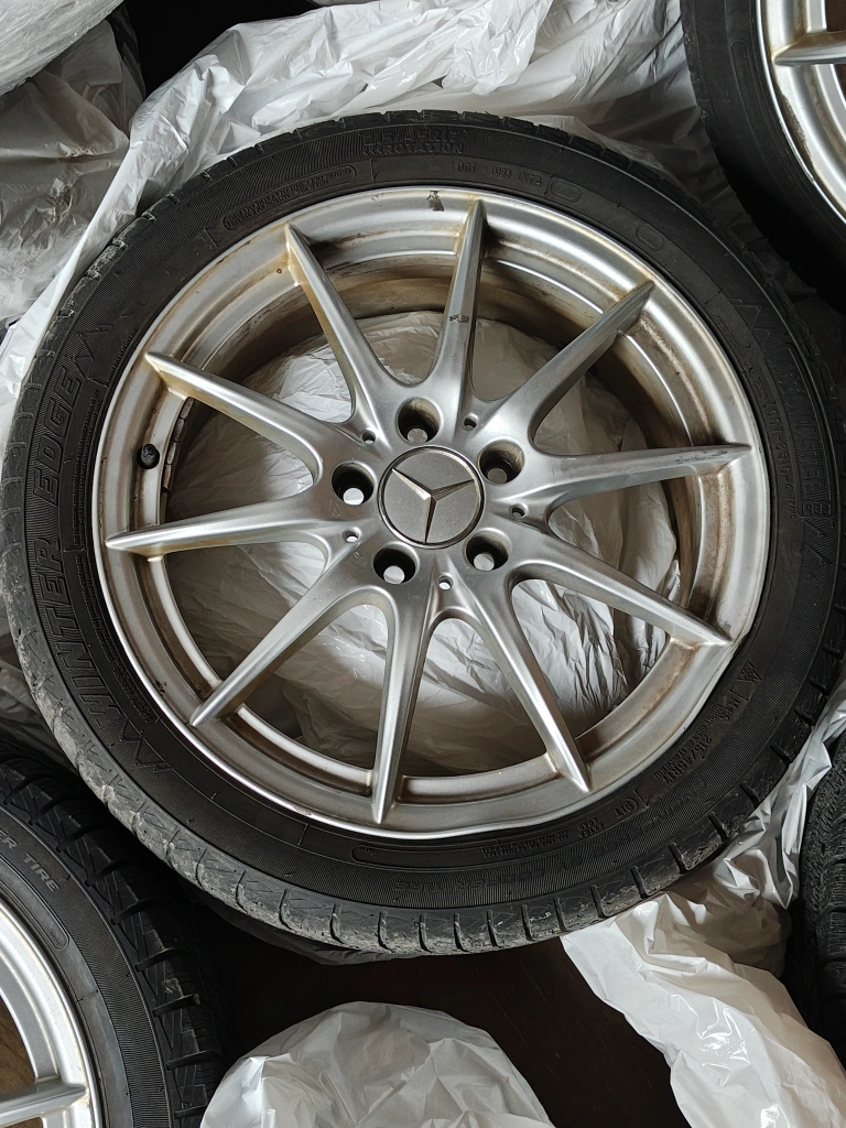 Selling a rare, full set of 10 spoke Mercedes-Benz rims fitted with Motomaster Winter Edge tires. The rims are German made original Mercedes products. 17" rims, 5x112 bolt pattern, 66.6mm hub. They have some road rash, one rim has two small dents (see 9th pic) which does not affect performance. The tires are size 215/45R17. Three of the tires are good, one is marginal.