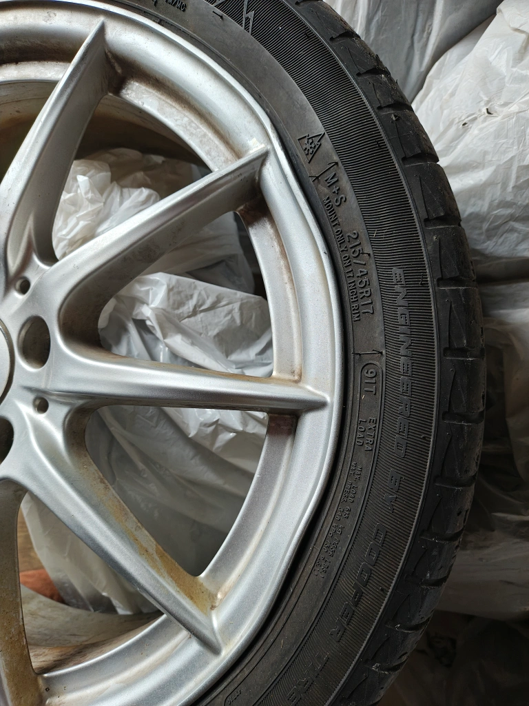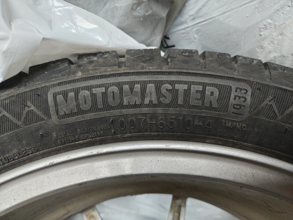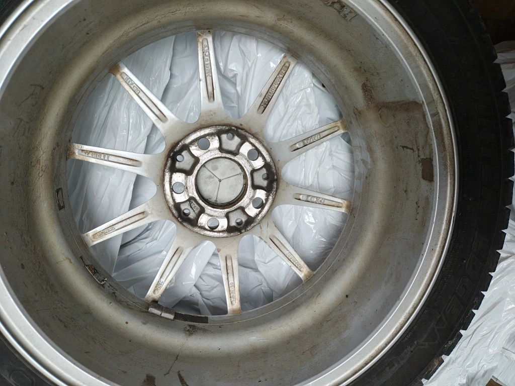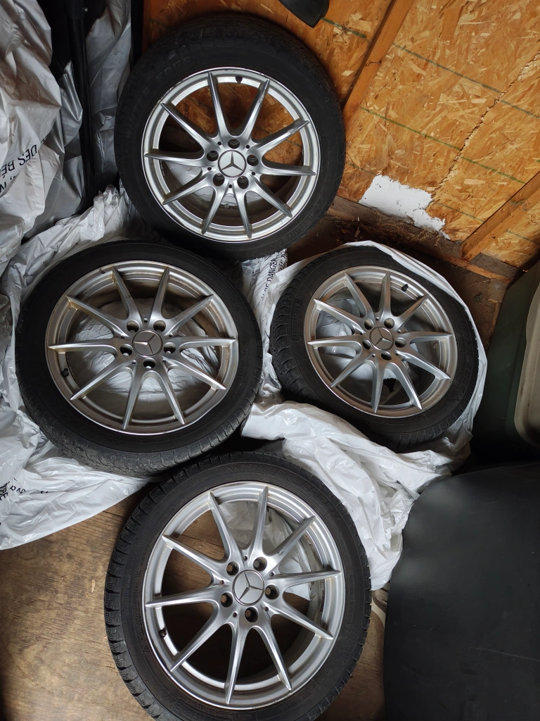 Selling a rare, full set of 10 spoke Mercedes-Benz rims fitted with Motomaster Winter Edge tires. The rims are German made original Mercedes products. 17" rims, 5x112 bolt pattern, 66.6mm hub. They have some road rash, one rim has two small dents (see 9th pic) which does not affect performance. The tires are size 215/45R17. Three of the tires are good, one is marginal.