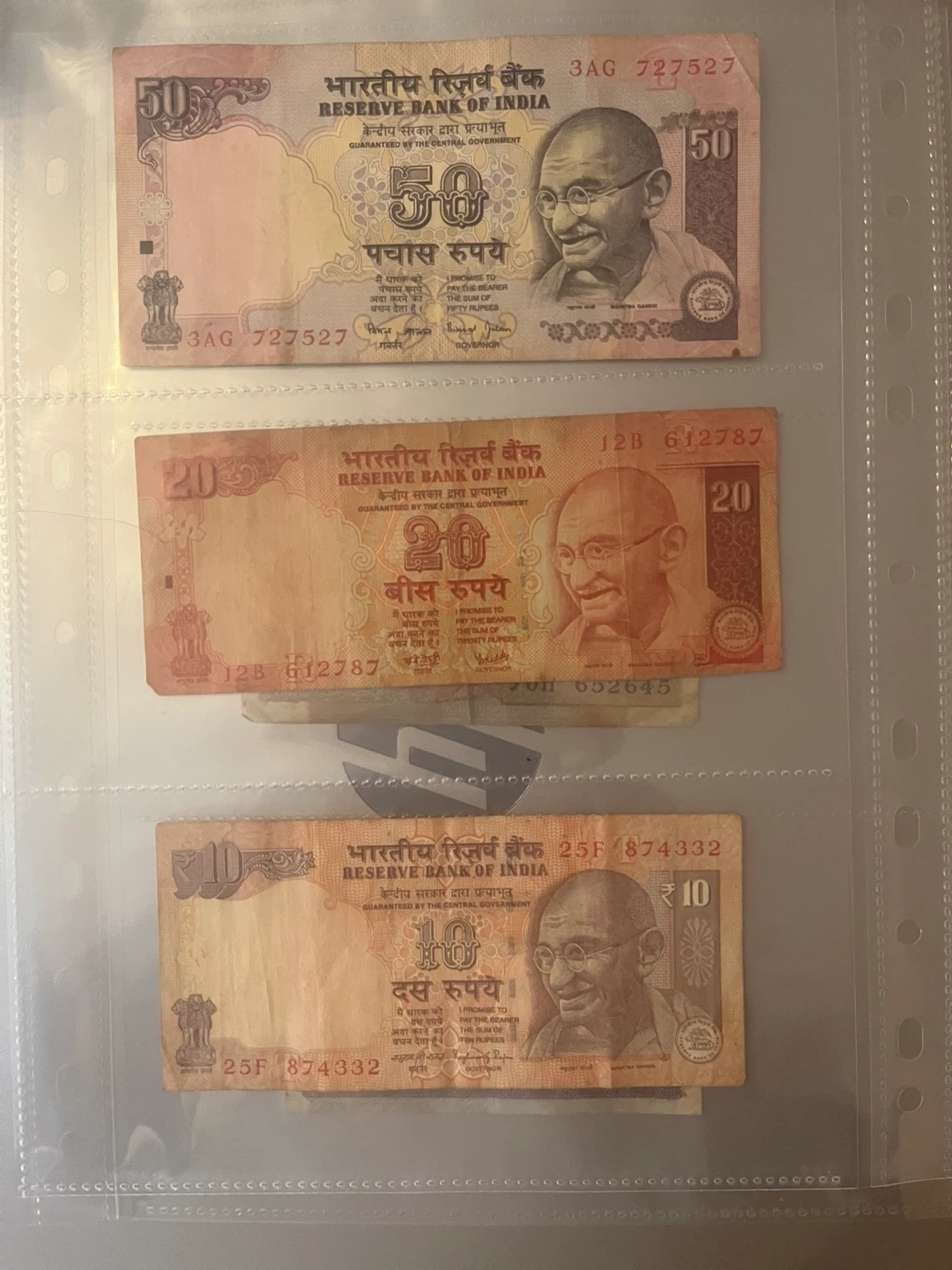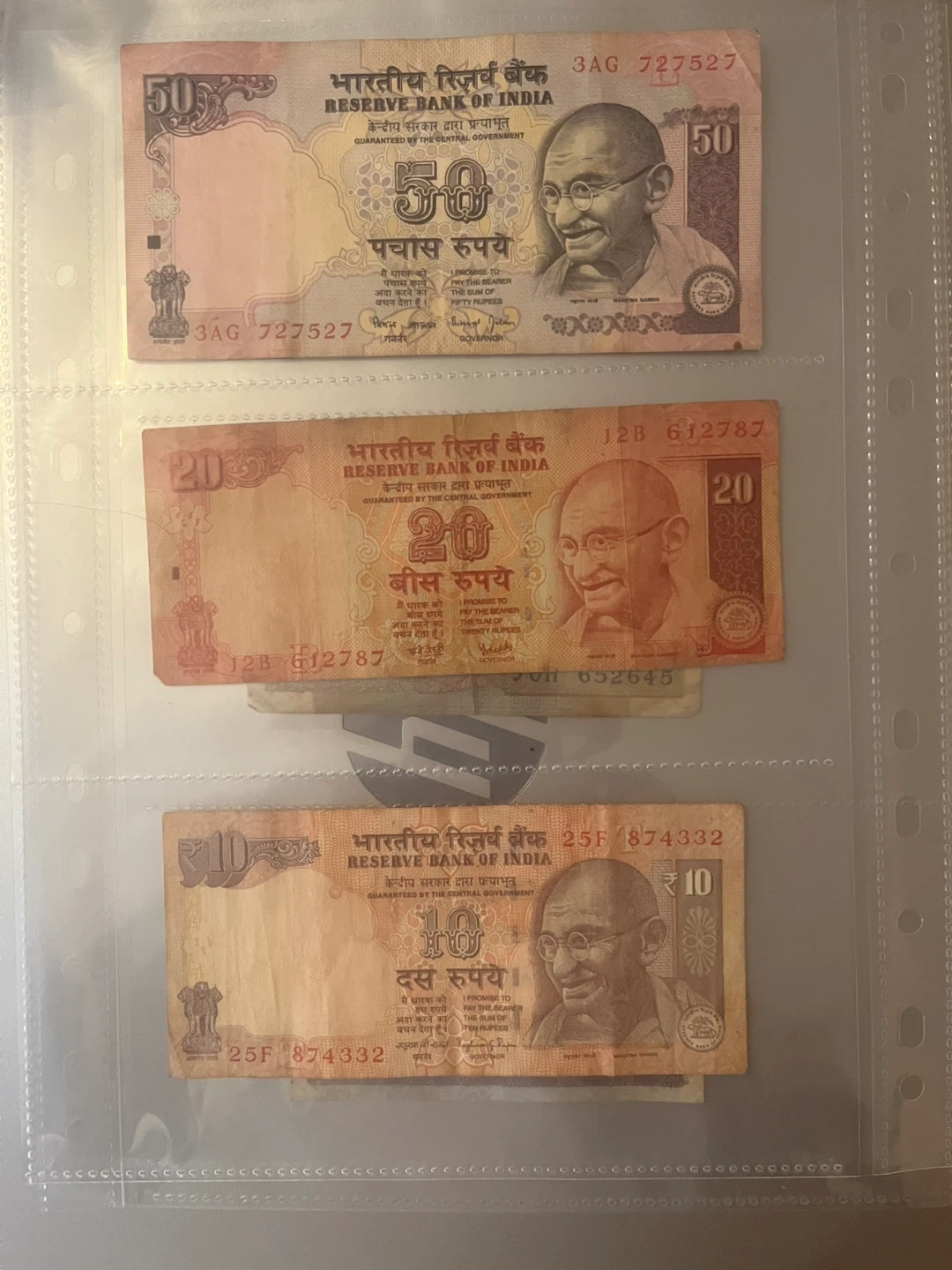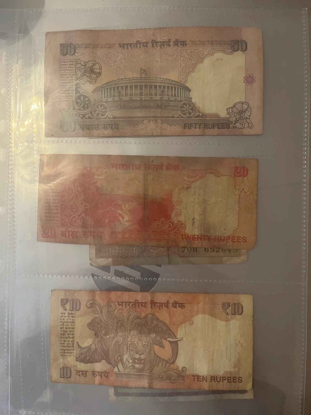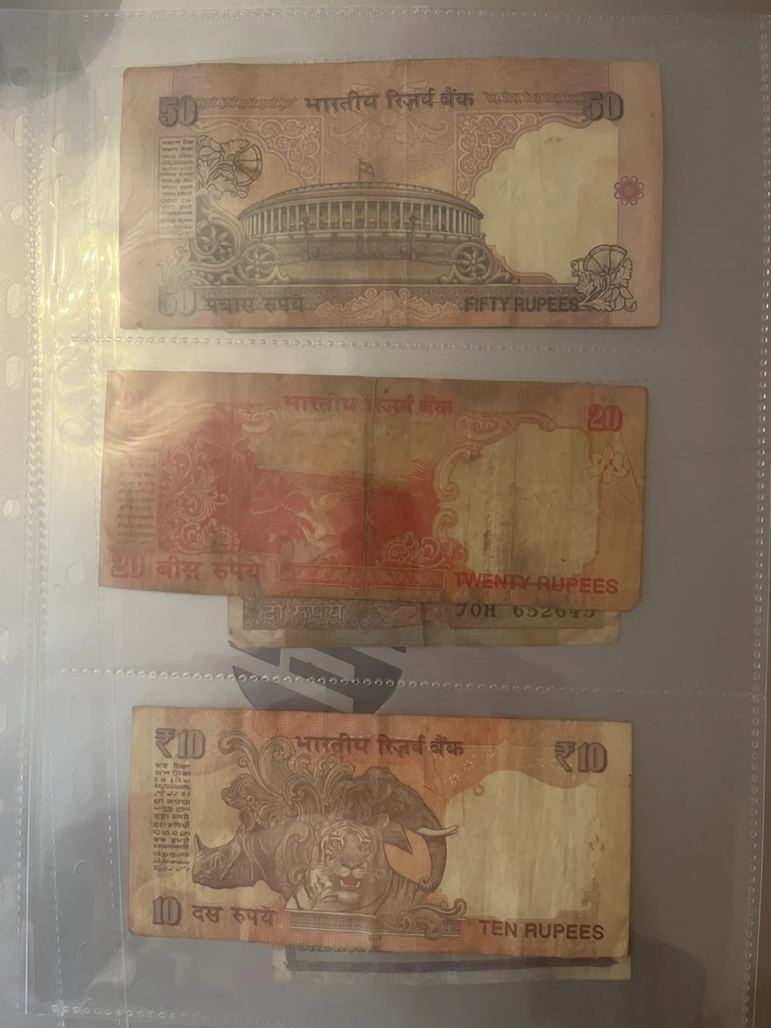 208Ten rupees twenty rupees and fifty rupees Indian notes with a collector plastic cover five dollars each three 10 dollars only limited period available go back to hometown