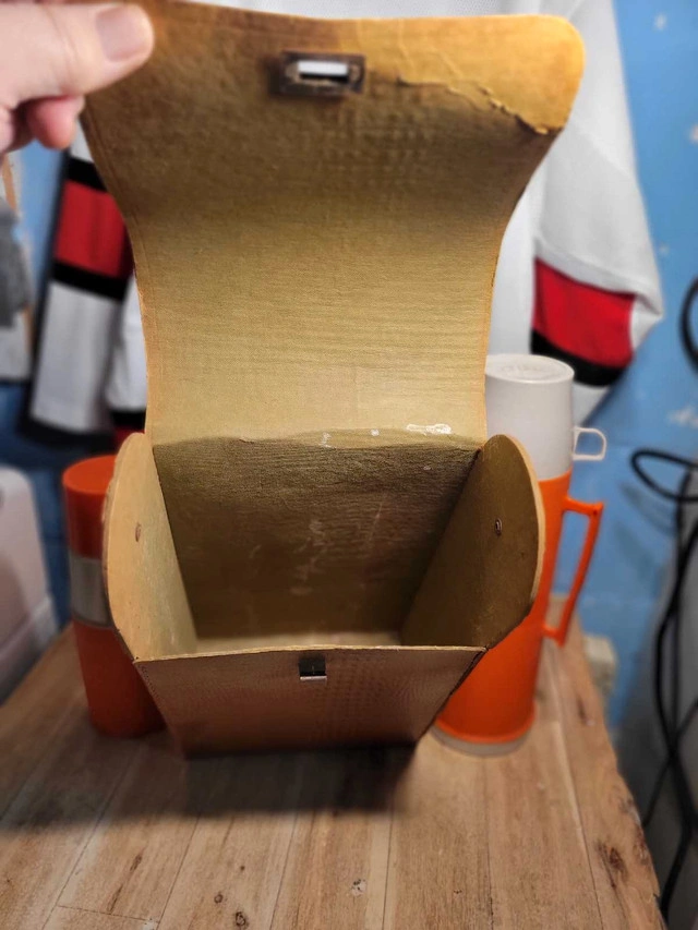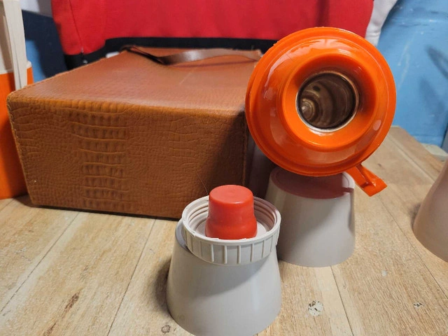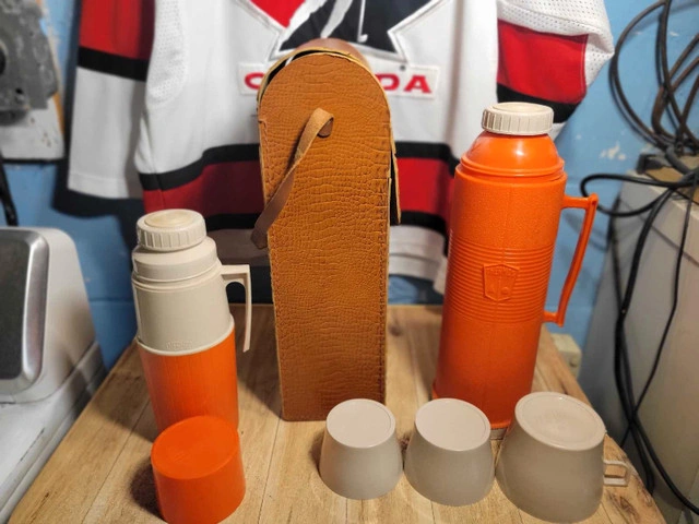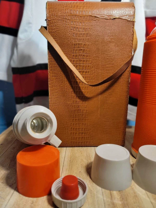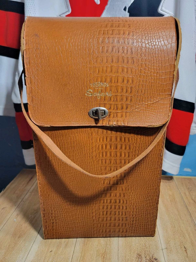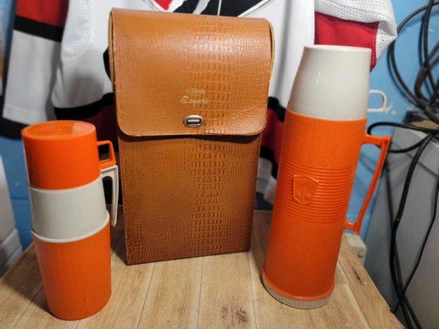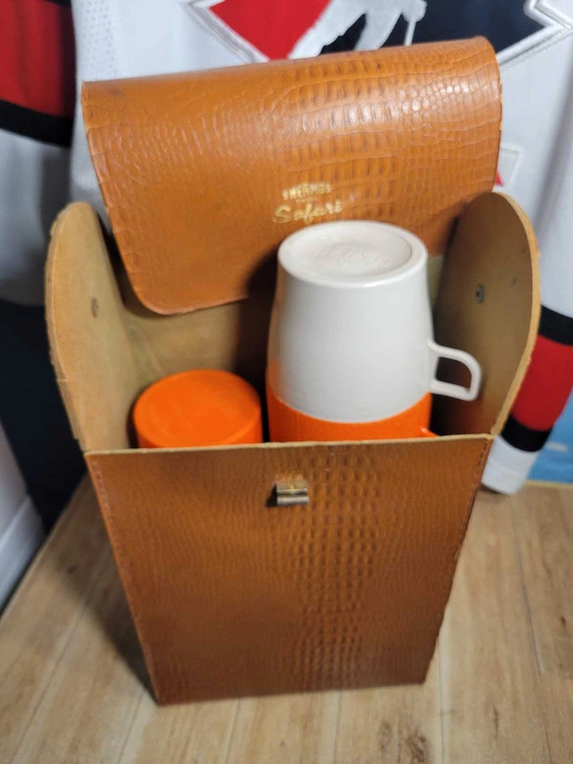 This vintage Thermos Safari kit is complete with large and small Thermos with all the lids and stoppers in very good condition. Comes with leather carrying case. Perfect with a picnic basket as it has a shoulder strap.