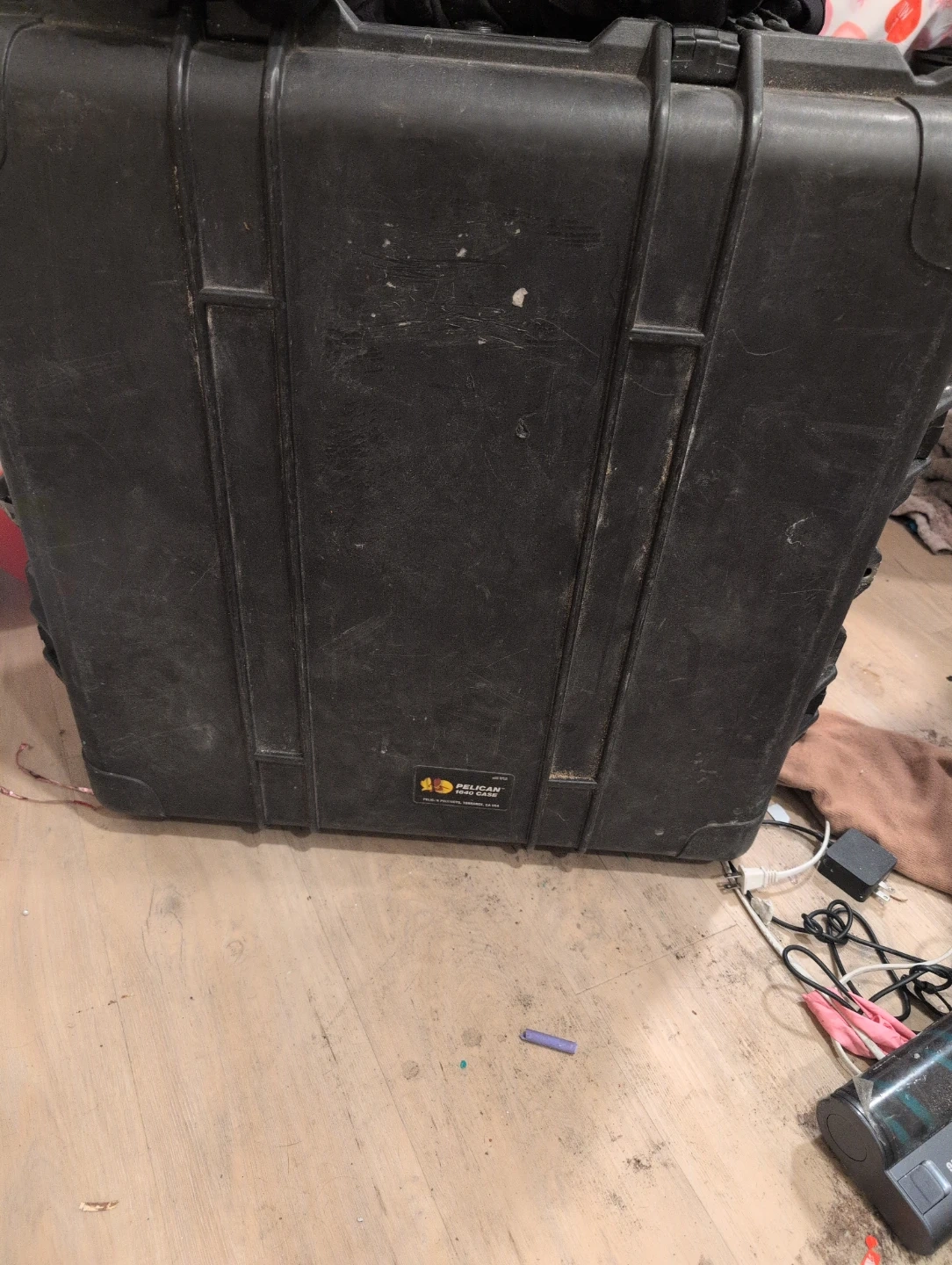This is a used black Pelican 1640 Case. It's made of durable plastic and has a sturdy construction for protecting equipment. The case shows some scuffs and scratches from normal use. It's a hard case suitable for transport.