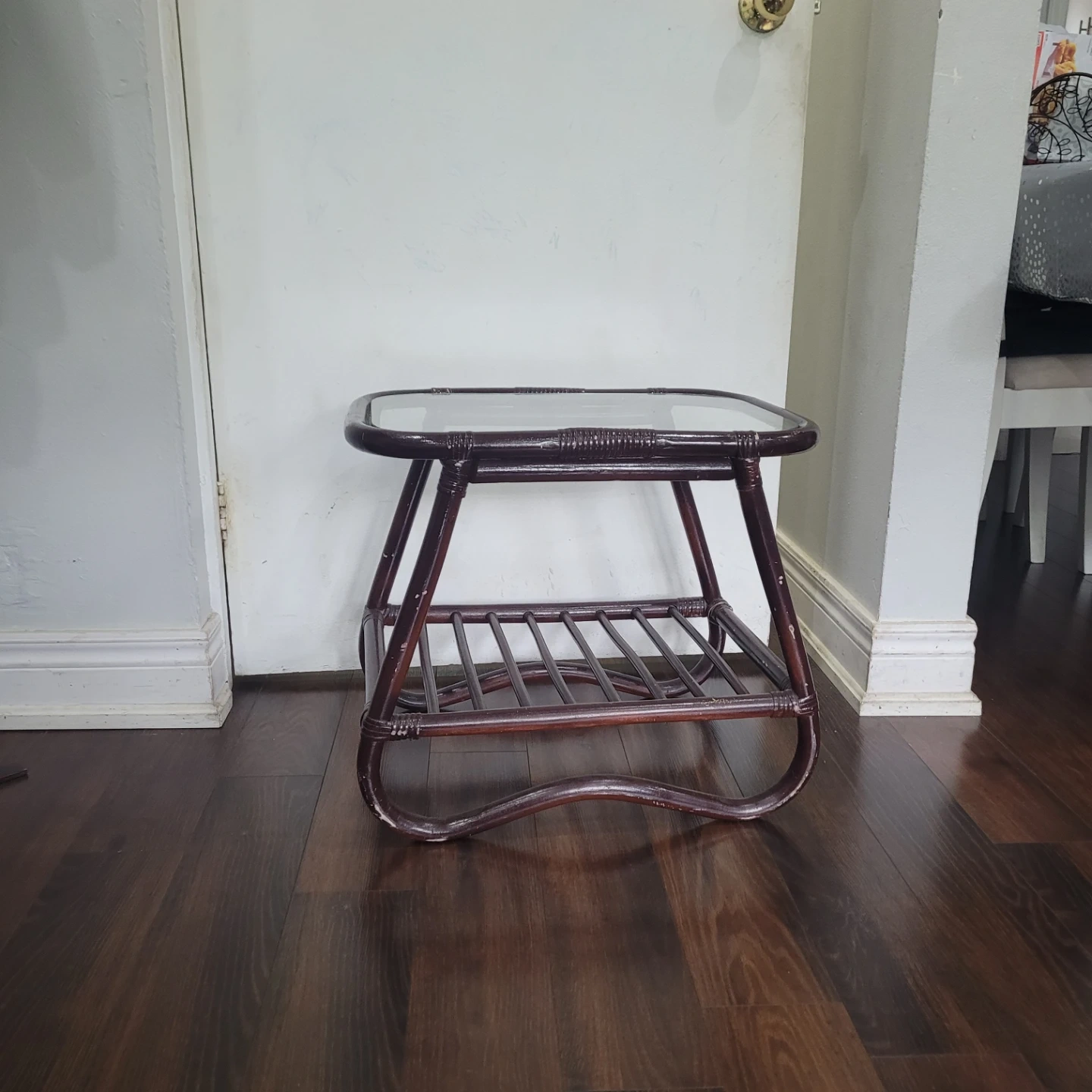 36🥕Selling a charming rattan accent table with a glass top! It's perfect for adding a touch of vintage style to your living room or bedroom. This table is sturdy and in great shape, ready to hold your favourite books or decor