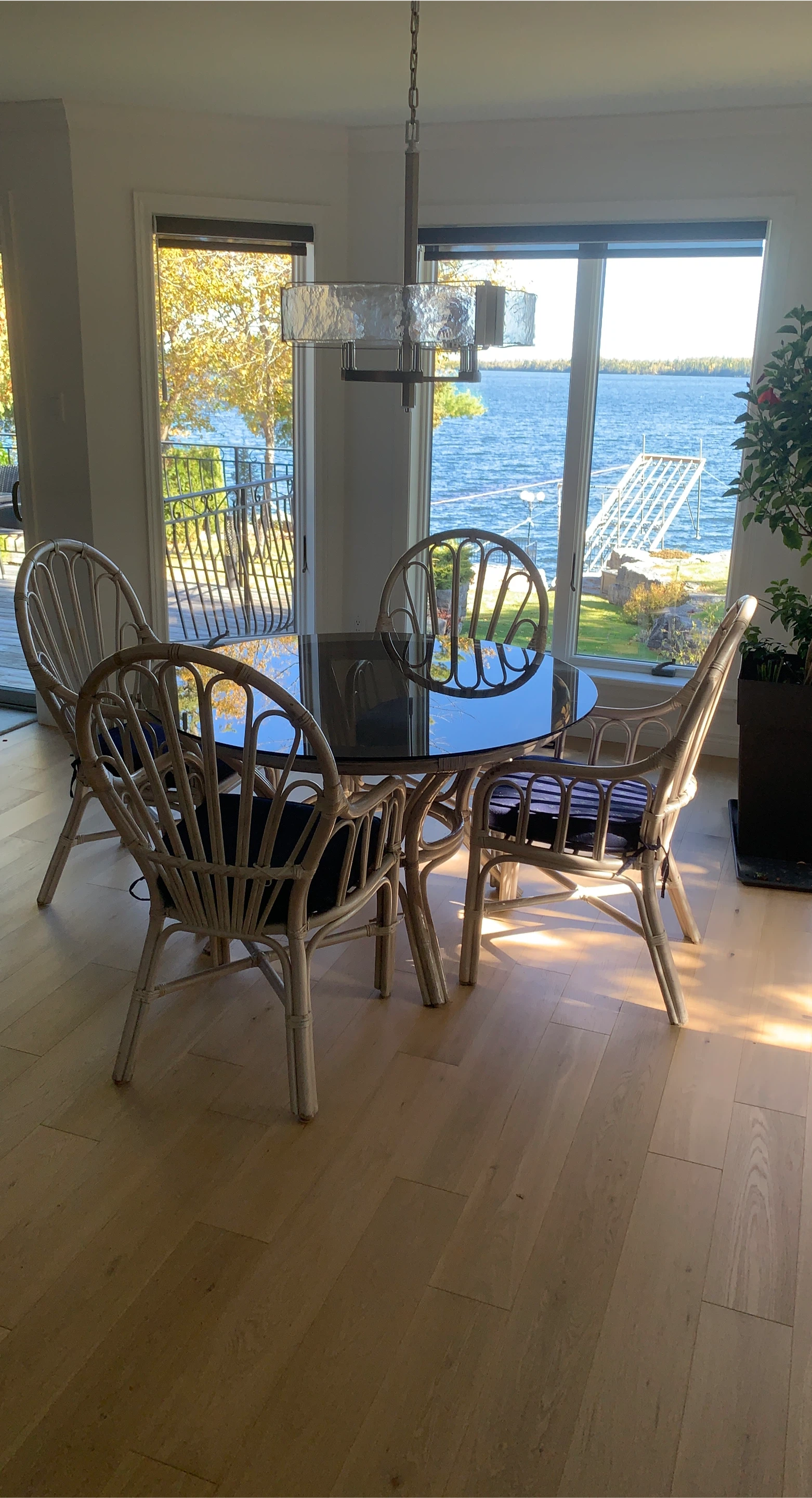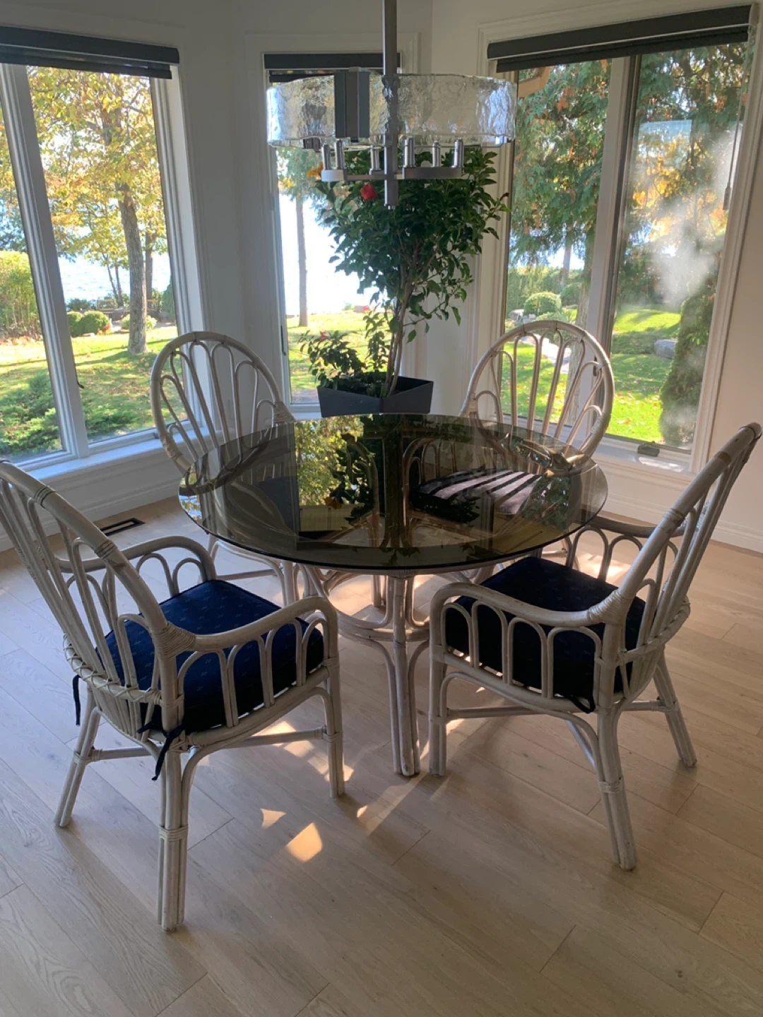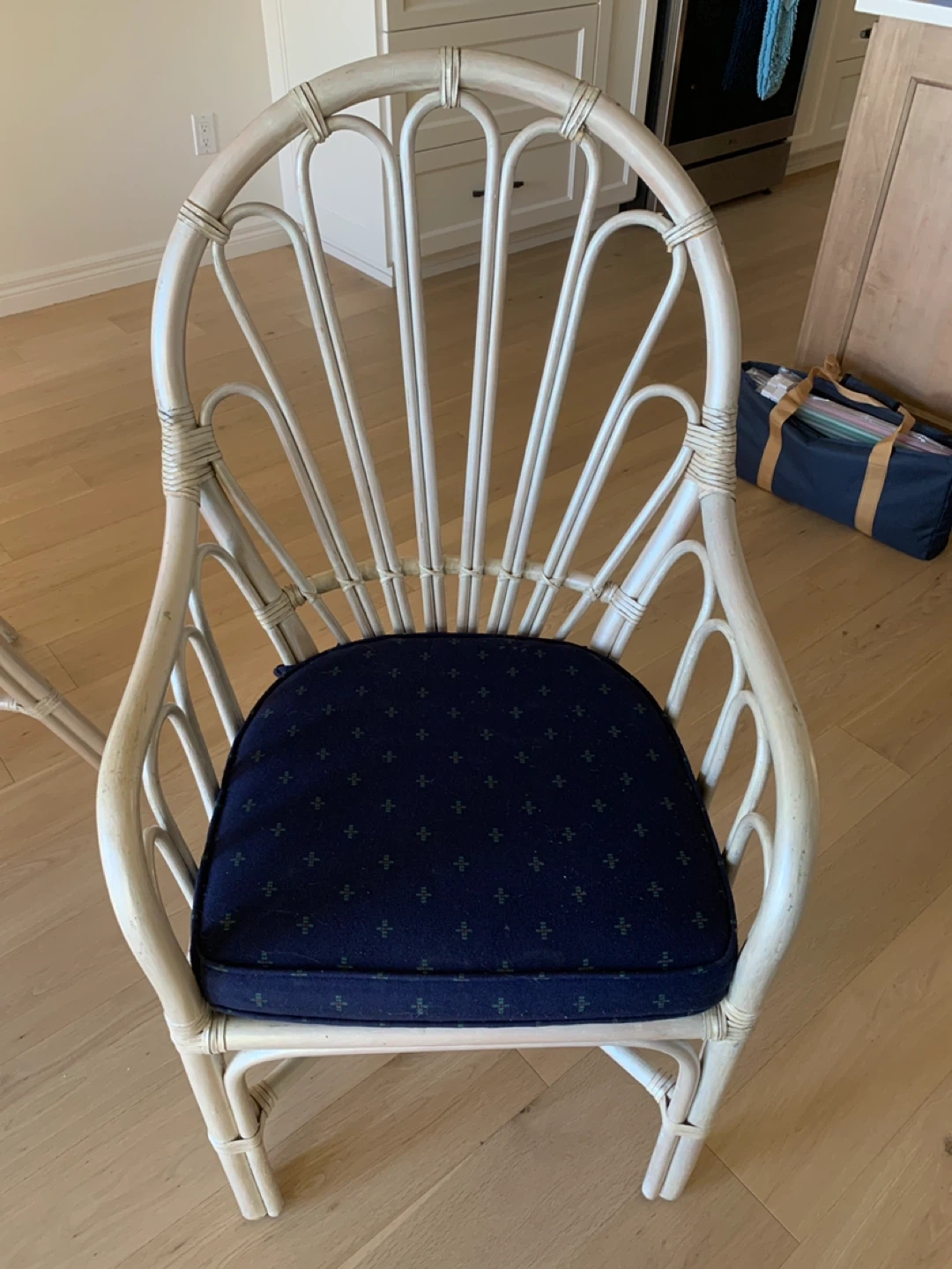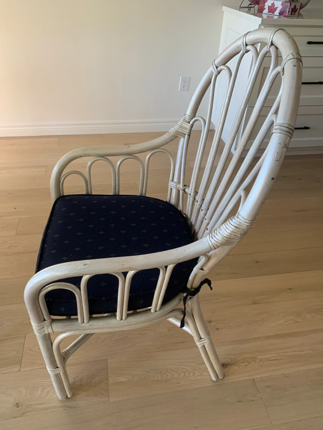 Selling a set of four rattan dining chairs. They feature a lovely white-painted rattan frame and navy blue seat cushions. Perfect for adding a touch of coastal or bohemian style to your dining space!