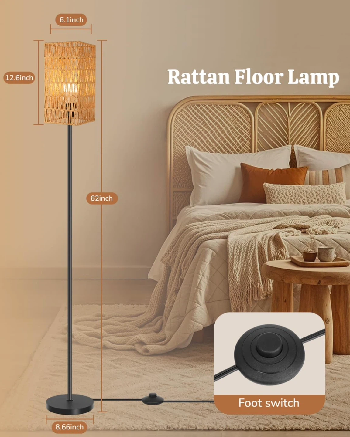 103Finish type Painted Base material Metal Bulb base E26 Product Dimensions 22D x 22W x 158H Centimetres Item weight 2.46 Kilograms Lamp type Floor Lamp Handwoven Ratan Shade: Our rattan floor lamp features a meticulously handwoven rattan shade, ensuring superior craftsmanship and durability compared to mass-produced alternatives. This standing lamp is designed to be the suitable size, making it ideal for any corner or narrow space without taking up too much visual space. Perfect for living room, Bedroom, Office 3-Way Dimmable & LED Bulb Included: This floor lamp for living room includes a energy-efficient 9W LED bulb, offering three adjustable eye-caring color temperatures (3000K warm white, 4000K cool white, 6000K daylight) to adapt to various activities like reading, relaxing, or working. The convenient foot switch allows effortless brightness adjustment without bending down Sturdy Metal Base: The floor lamp is built with a robust black metal base that provides exceptional stability. Unlike small base and wobbly thin-pole designs, it is firm in place, making this standing lamps ideal for homes with kids/pets Versatile Style Compatibility: Designed with a black metal frame and a natural rattan shade, this tall lamp effortlessly blends into Bohemian, rustic farmhouse, Japanese-inspired, and vintage interior themes. Whether placed beside a sofa in the living room or creating a cozy corner in the bedroom, this lampe sur pied pour salon adds a warm, inviting ambiance to any space