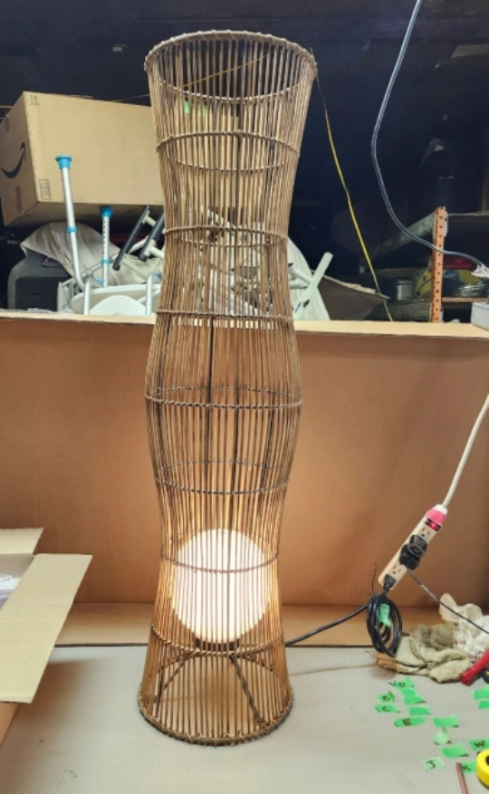 205A stylish floor lamp crafted from rattan. The woven design creates an interesting pattern. The lamp includes a warm light inside. Perfect for creating a tranquil space. Large dramatic lamp msrp 378.99+