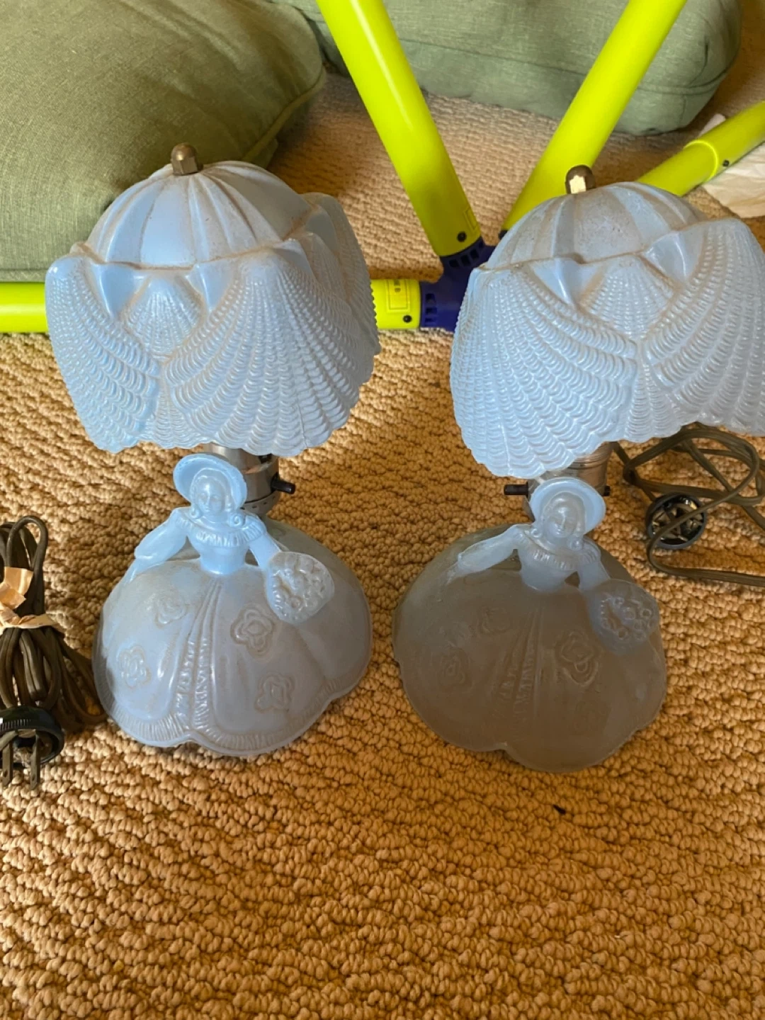 These are a pair of vintage blue glass lamps featuring figurine bases and detailed shades. The lamps have a unique art deco style with a frosted finish. Both lamps come with power cords, though one shows wear and tear on the wiring.