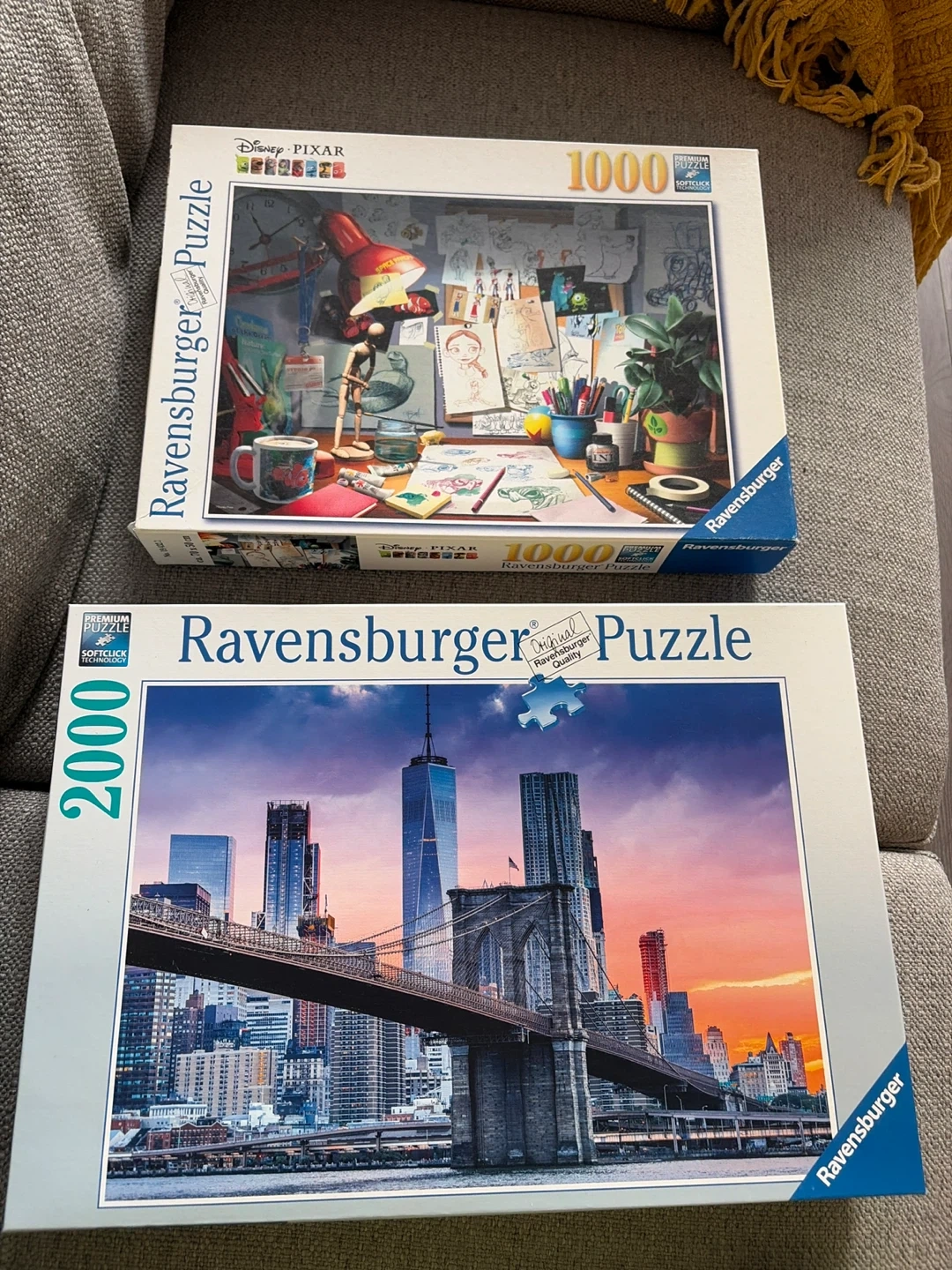 Selling two Ravensburger puzzles! One is a Disney Pixar 1000-piece puzzle, and the other is a 2000-piece puzzle featuring a city landscape