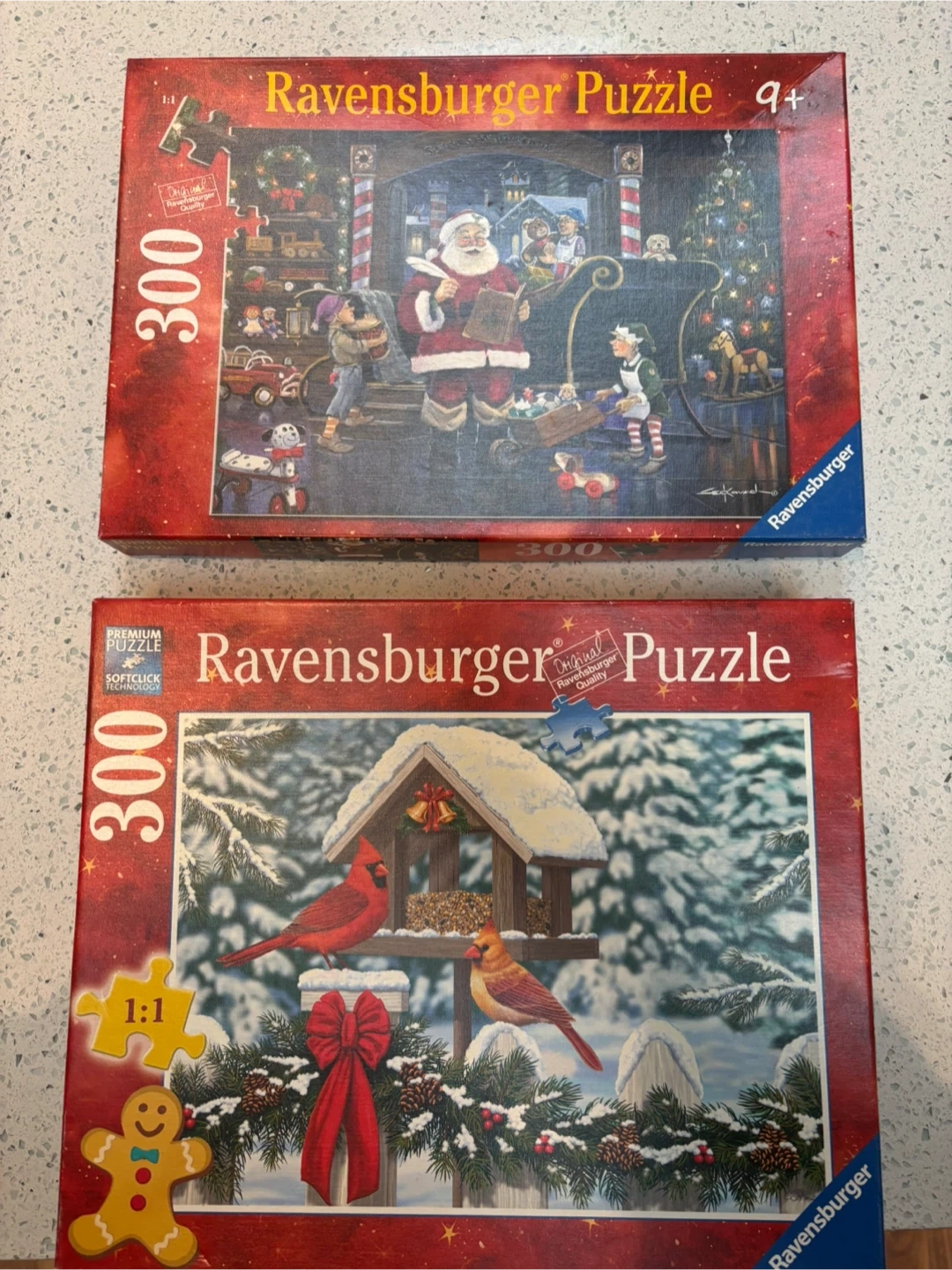 35Two Ravensburger puzzles, each with 300 pieces! One features a Santa Claus scene and the other has a winter birdhouse with cardinals. Great for ages 9+. All pieces present. $10 for both.