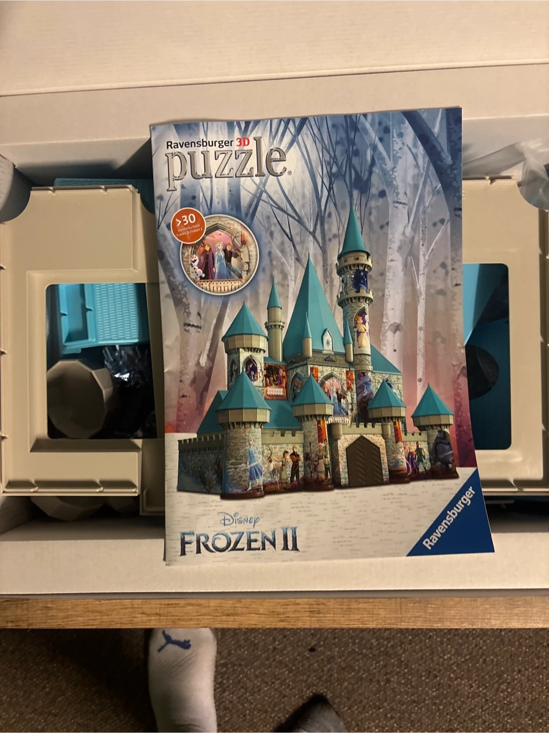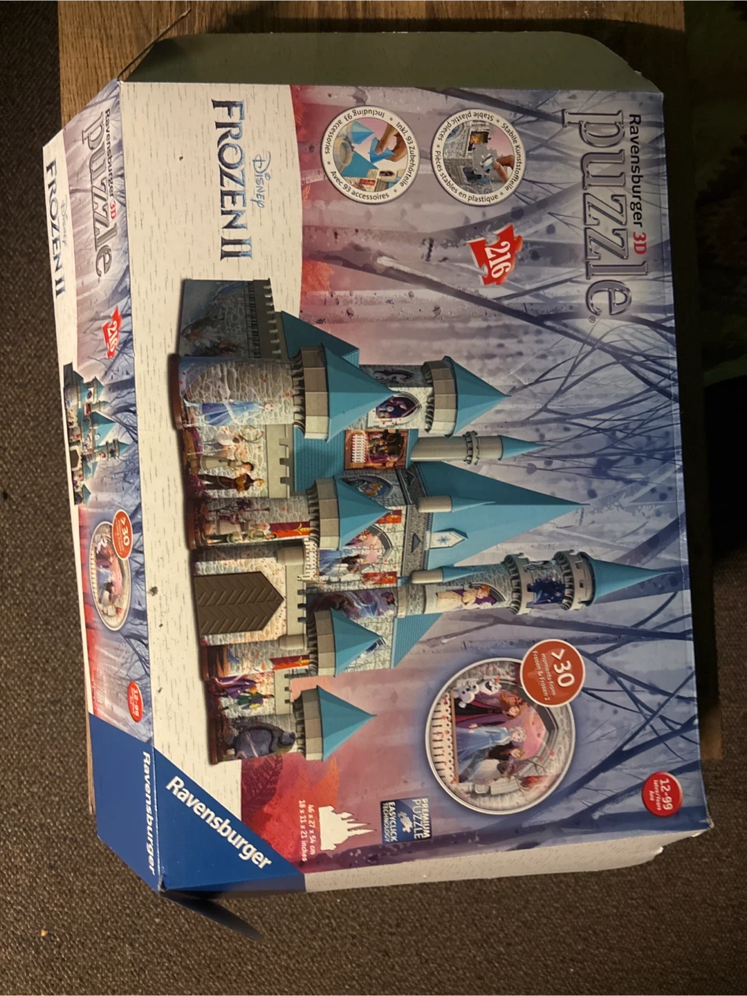 Selling a Ravensburger Disney Frozen II 3D puzzle. It's a 216-piece puzzle that makes a lovely castle. Recommended for ages 12-99. The box is included!