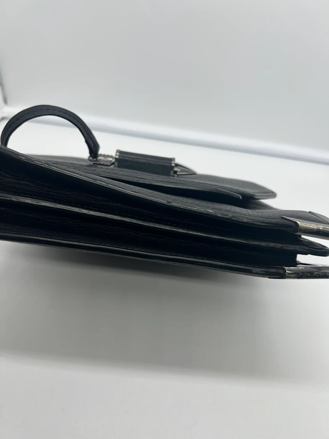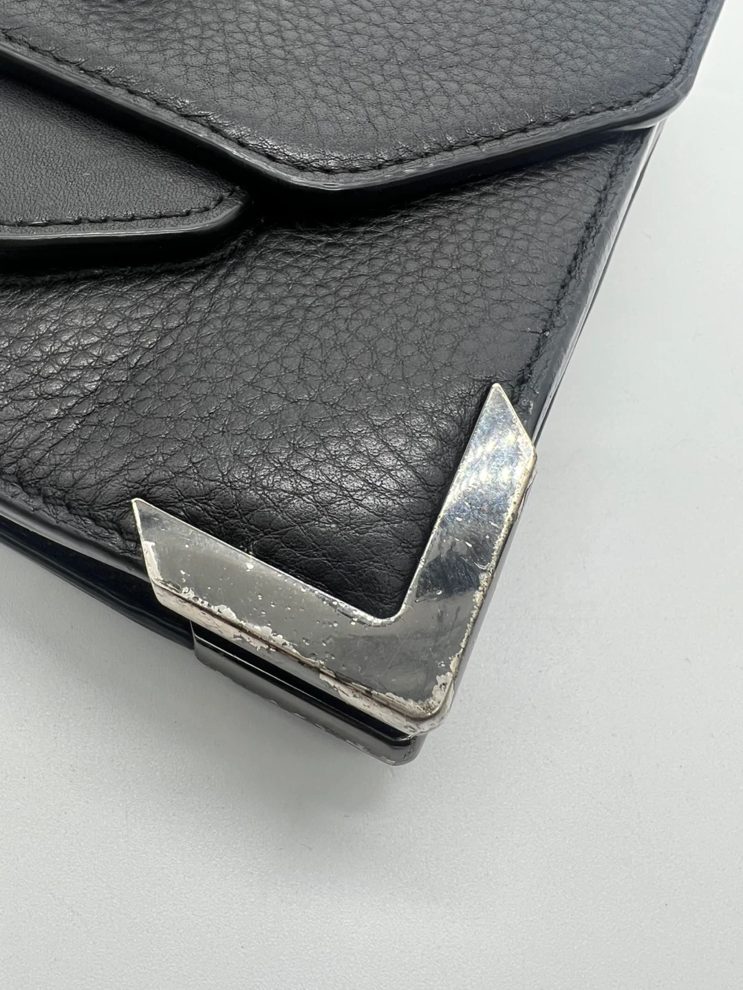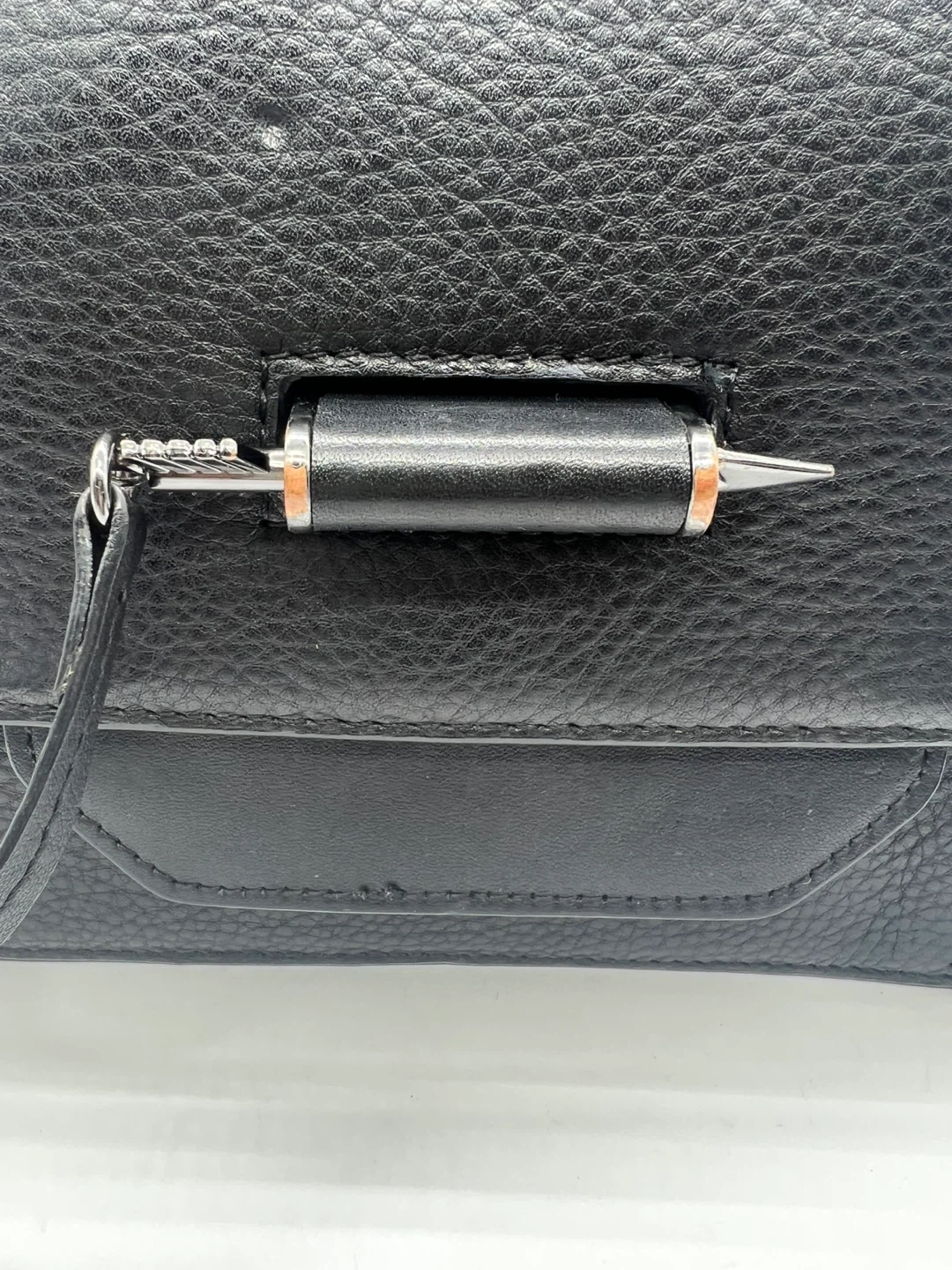 Faint scuffing/tarnishing on the hardware. Faint wear on the body. White marks on the inside pockets/brand tab.