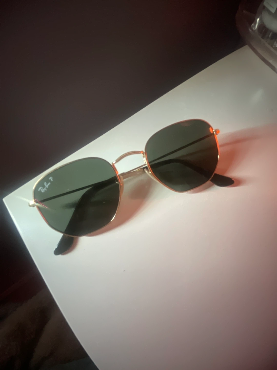 24Selling a pair of Ray-Ban Hexagonal Flat Lenses sunglasses. These stylish sunglasses feature a gold frame and green lenses. Originally bought for $293!