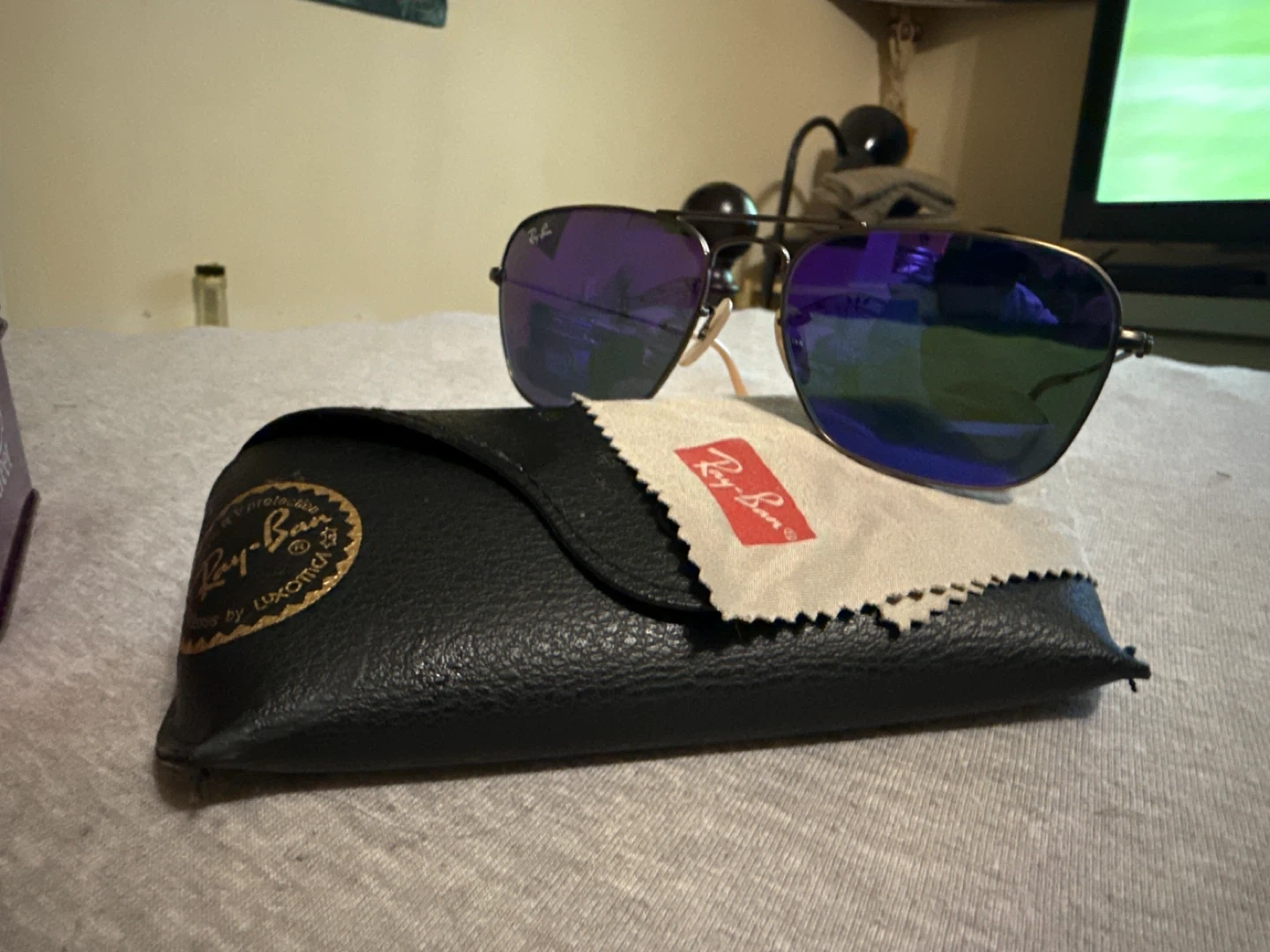 VERY VERY VERY RARE!! Selling a pair of Ray-Ban RB3136 Caravan sunglasses. They come with the original case and cleaning cloth. The lenses have a cool purple tint. They're in great shape and ready for a new owner!