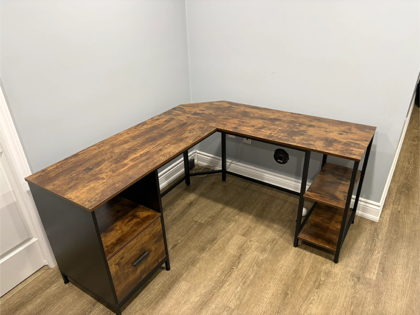 This L-shaped desk offers a spacious work surface with a built-in drawer and two open shelves for storage. Its rustic wood grain finish and black metal frame blend well in most home office setups. The desk provides ample room for computers, documents, and decor.