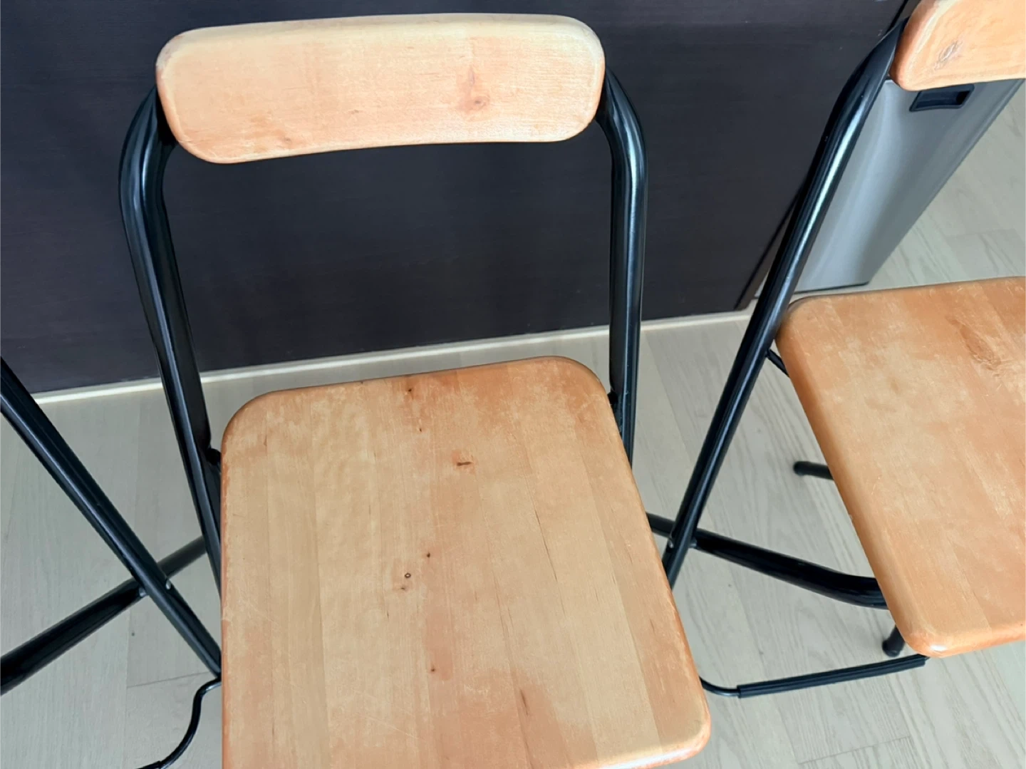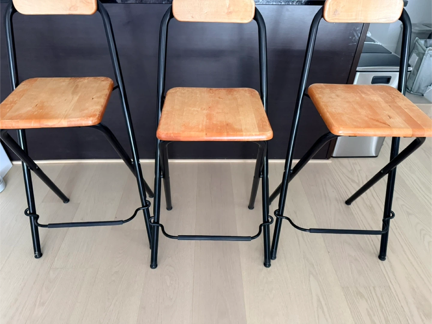 Three folding chairs with light wood seats and backrests. They have black metal frames and fold flat for easy storage. Perfect for extra seating when guests are over!