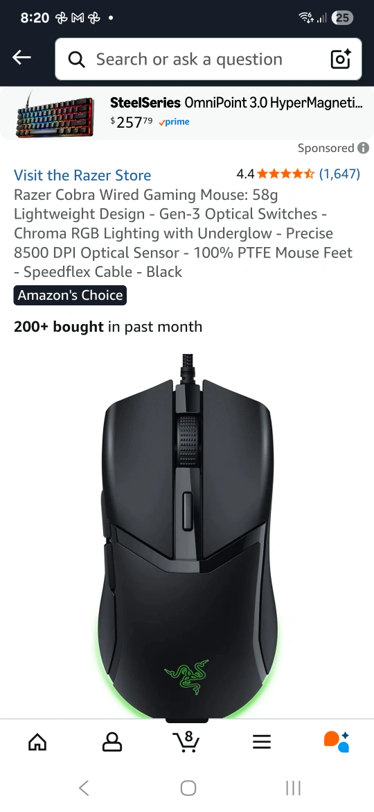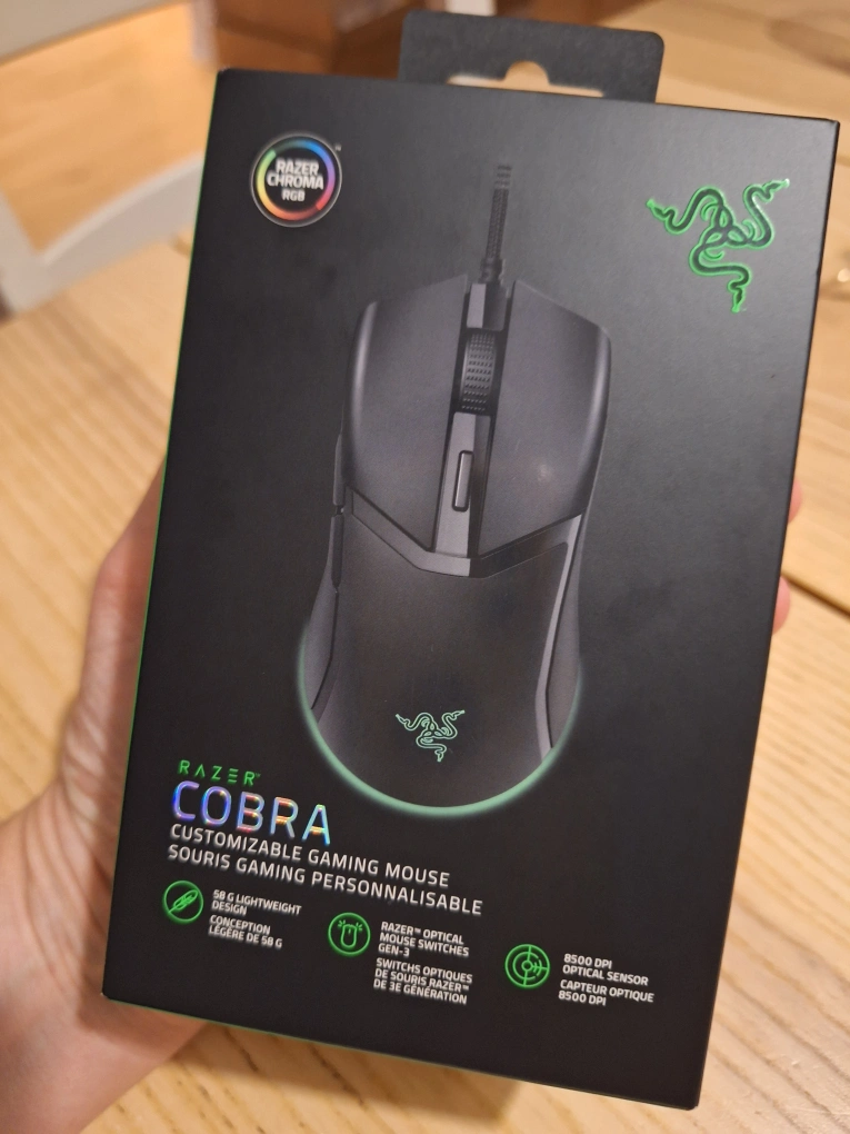 https://a.co/d/iIpoXFQ Selling a brand new Razer Cobra wired gaming mouse, still in its original box! My son won this in an arcade machine, but he'd rather get cash :) It sells on Amazon for $60. It features: - 58g lightweight design - Razer Chroma RGB lighting with underglow - Razer optical switches - 8500 DPI optical sensor - Speedflex cable Perfect for any gamer looking for a responsive and customizable mouse