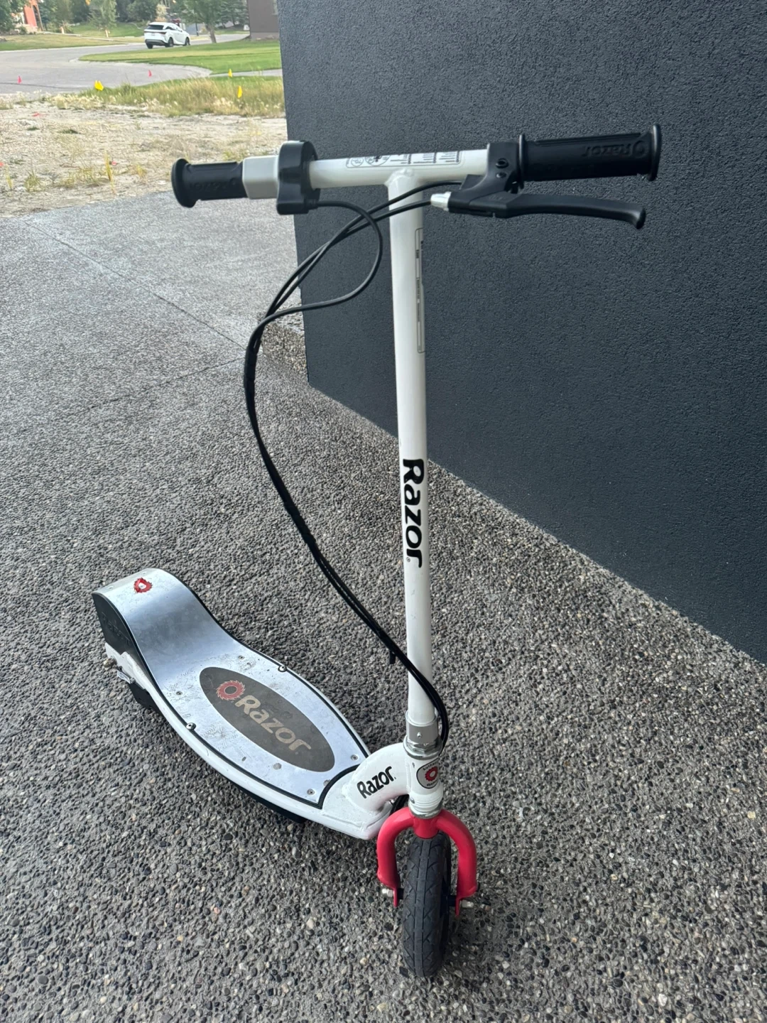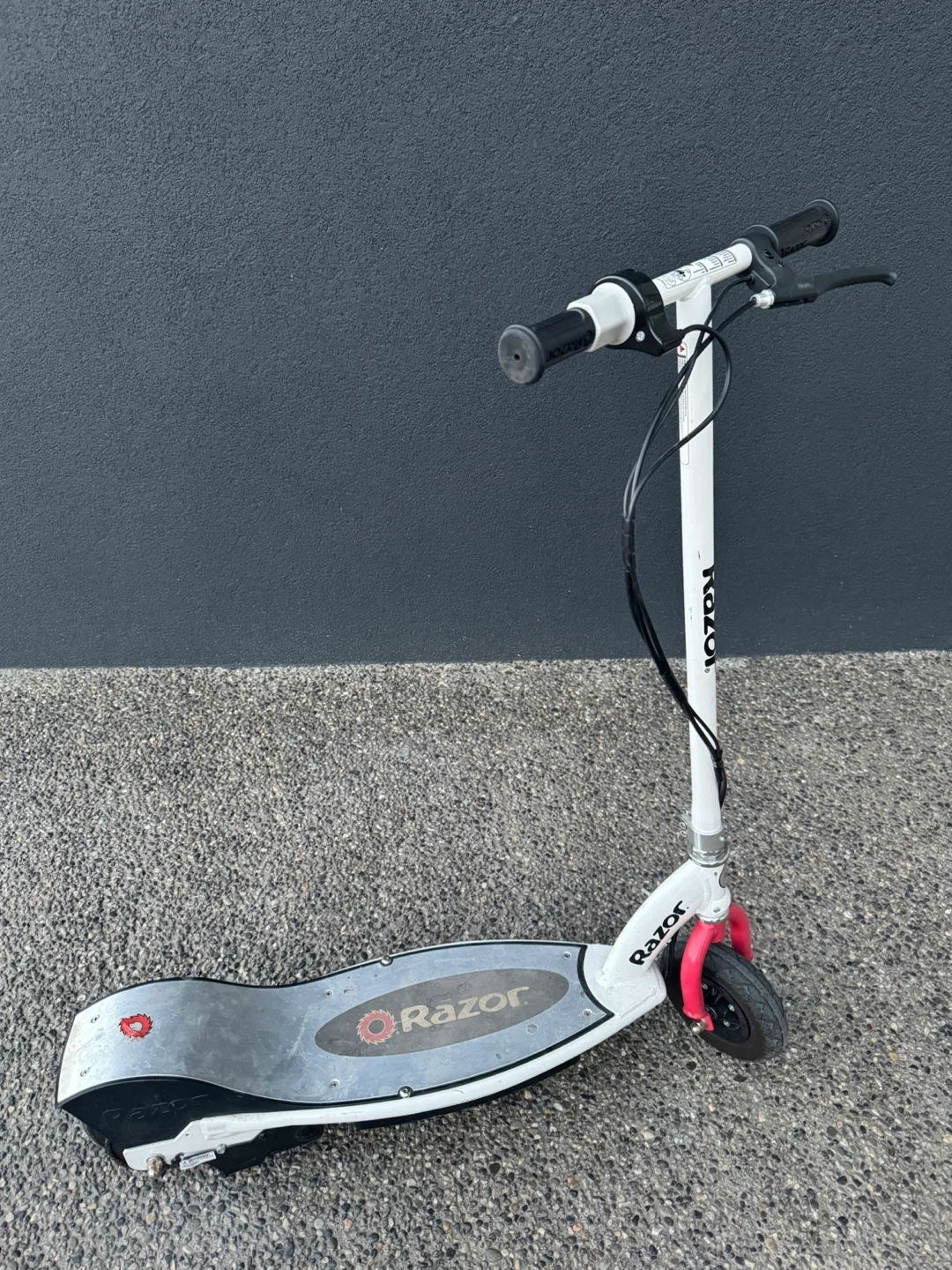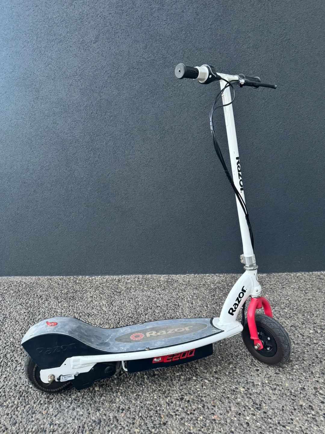 The Razor E200 offers the quality, safety, service, style you’ve come to expect from this leading manufacturer of youth lifestyle recreational products. . Boasting a high-torque, ultra-quiet chain-driven motor, and a handy twist-grip throttle . High-performance motor with speeds up to 12Mph. Run Time-Up to 40 minutes of continuous use . Features a hand operated rear brake, spring loaded kickstand, and large 8-inch pneumatic tires for a smooth ride . Recommended to support riders up to 154 pounds . Features rear wheel drive for increased traction and control Asking $200