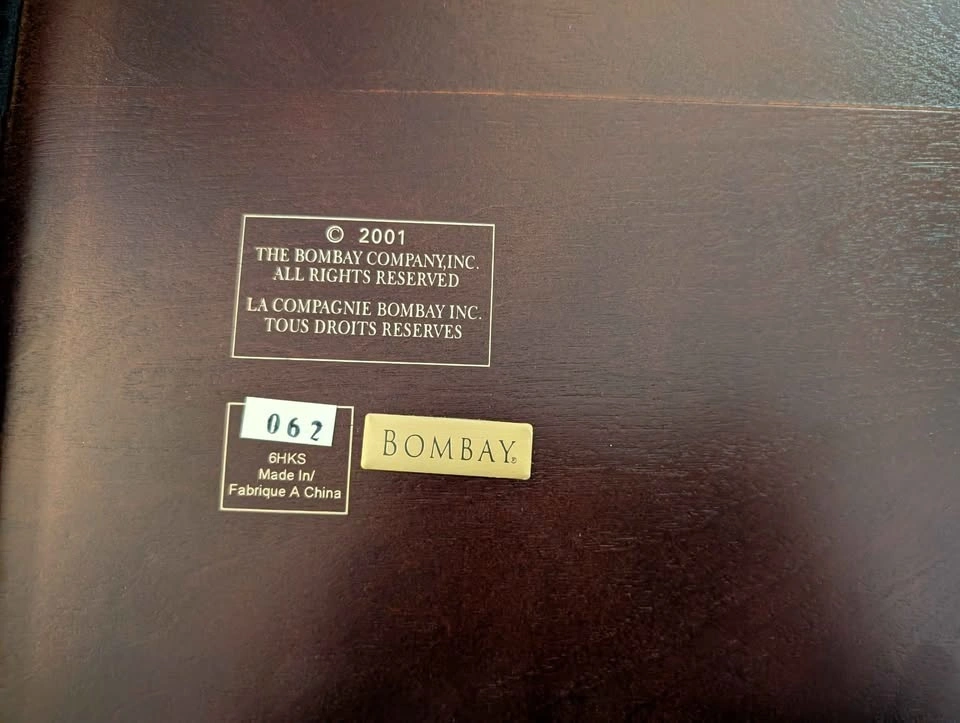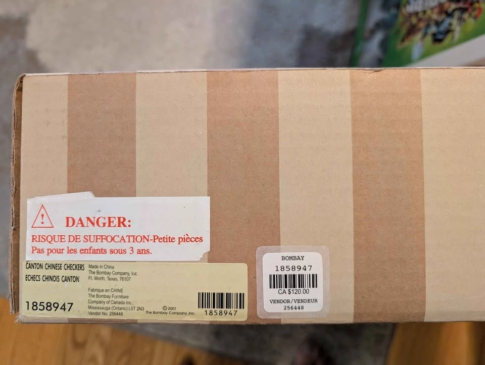 Bombay Company Classic Canton (Chinese) Checkers board game. A rare find! Dark wood board has cool brass cups in corners. Includes colourful glass marbles.
