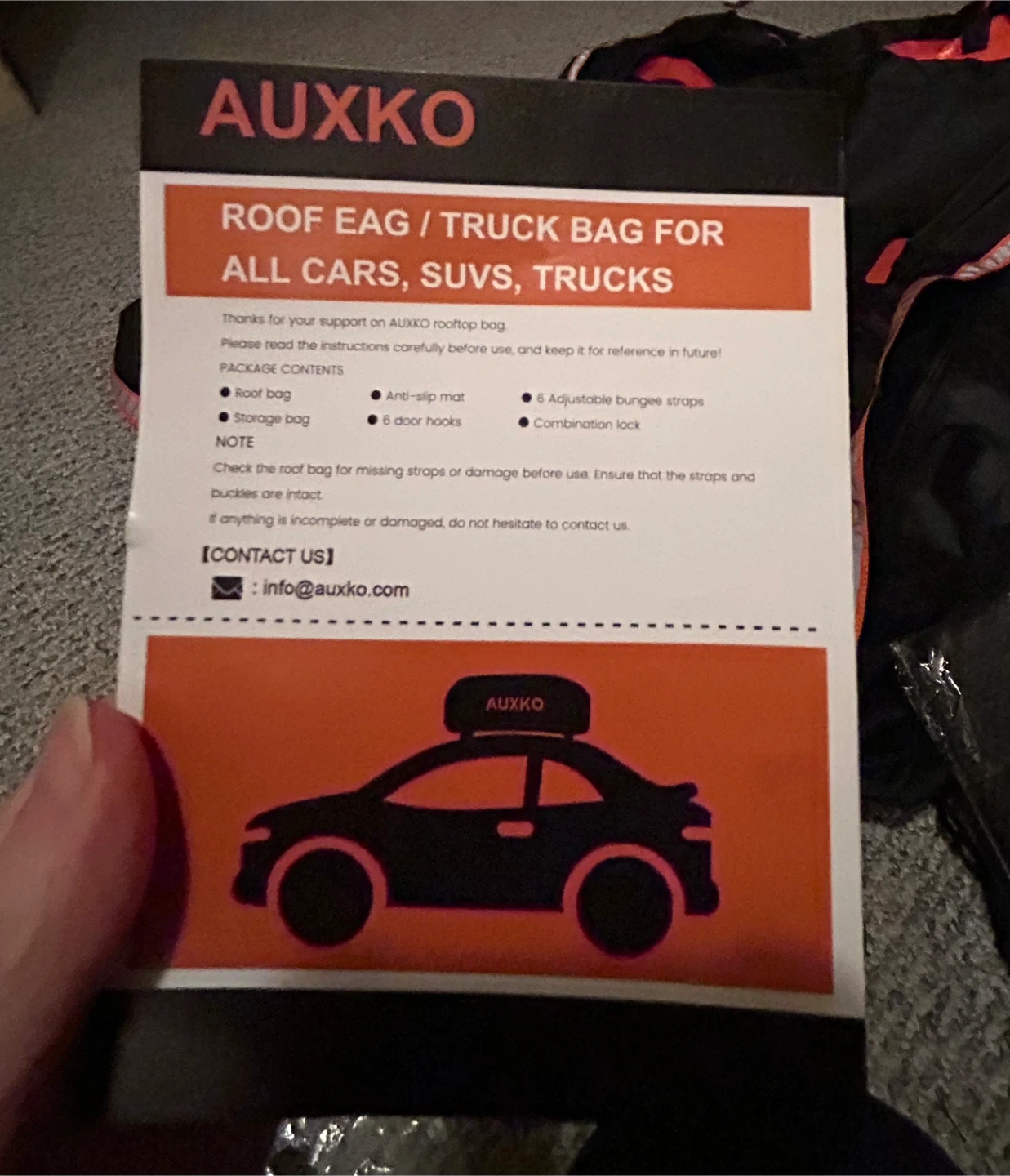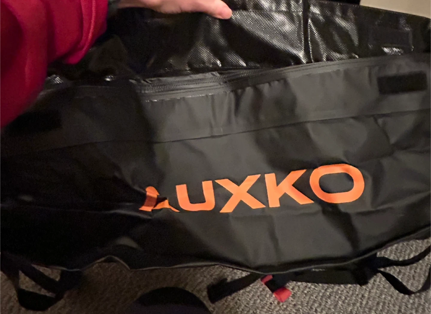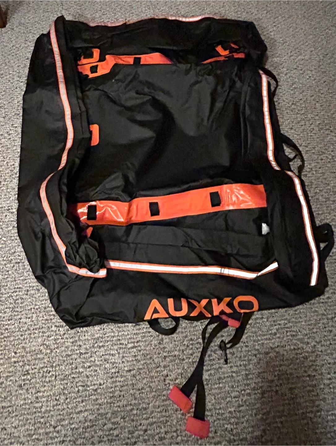 This is an AUXKO waterproof rooftop cargo carrier. It's made of 5mm thick PVC. Zipper is shielded with a waterproof flap and sealed tight using high-strength Velcro to keep belongings dry and protected under any condition.
