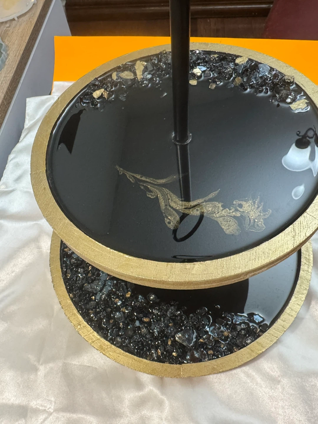 This is a beautiful two-tier decorative tray. It features a striking black and gold colour scheme, making it a stylish addition to any room. The tray is perfect for displaying decorative items or serving treats. It's in great condition and ready to add a touch of elegance to your home!