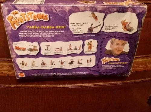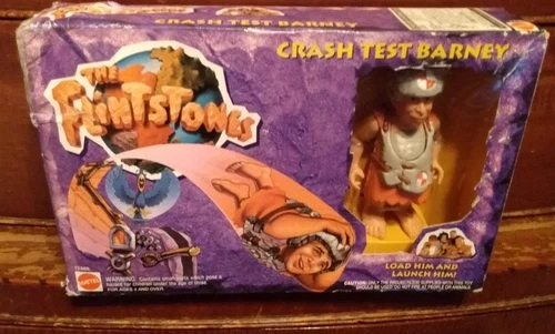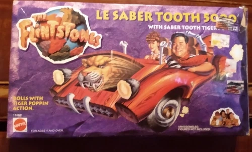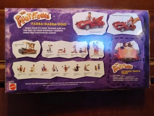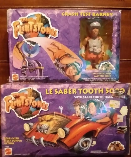 The Flintstones Movie Le Sabre Tooth 5000 Mattel Crash Test Barney Boxed and Complete. These toys are both in excellent condition with imperfect boxes they are no longer factory sealed but have been resealed. The crash test dummy Barney is brand new and has never been off the card only the box had been opened. Everything is in factory plastic and complete. Fred's lesabretooth 5000 is also complete with the saber-tooth tiger head and window bones along with a car in perfect condition however it is not wrapped in plastic. These are vintage collectible toys from the original 1993 Flintstone movie starring Rick moranis and John Goodman. Everything has been checked and cleaned.