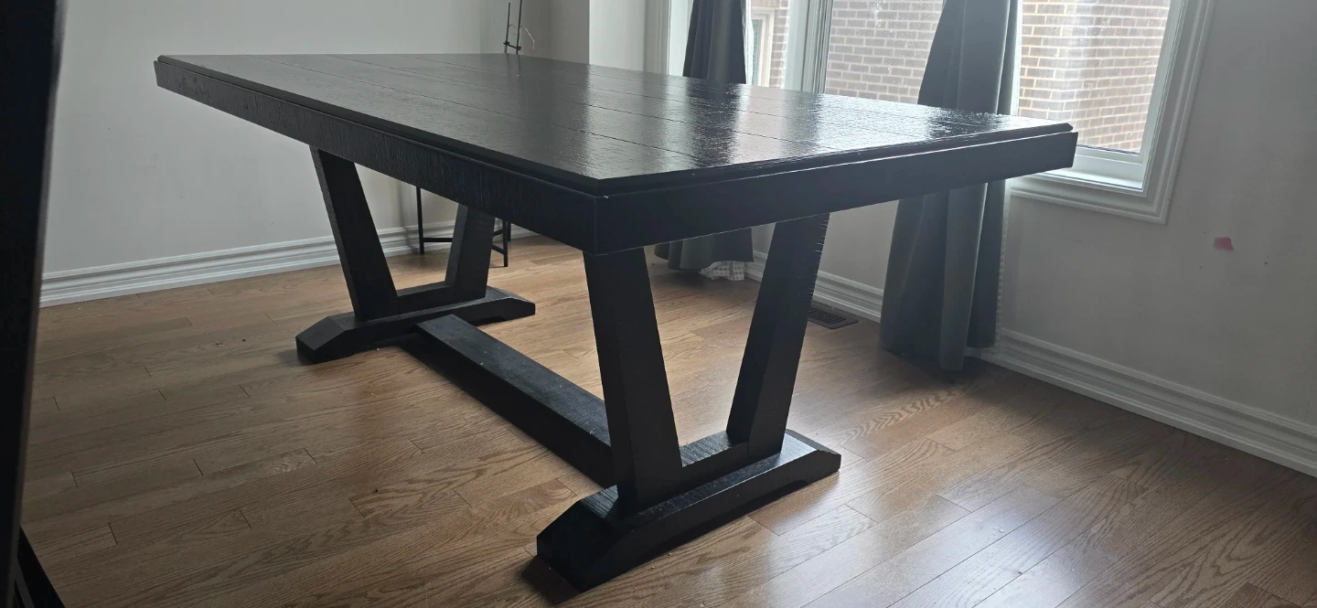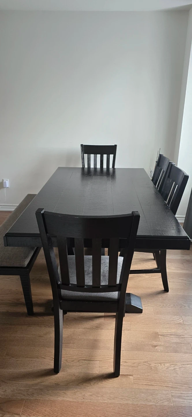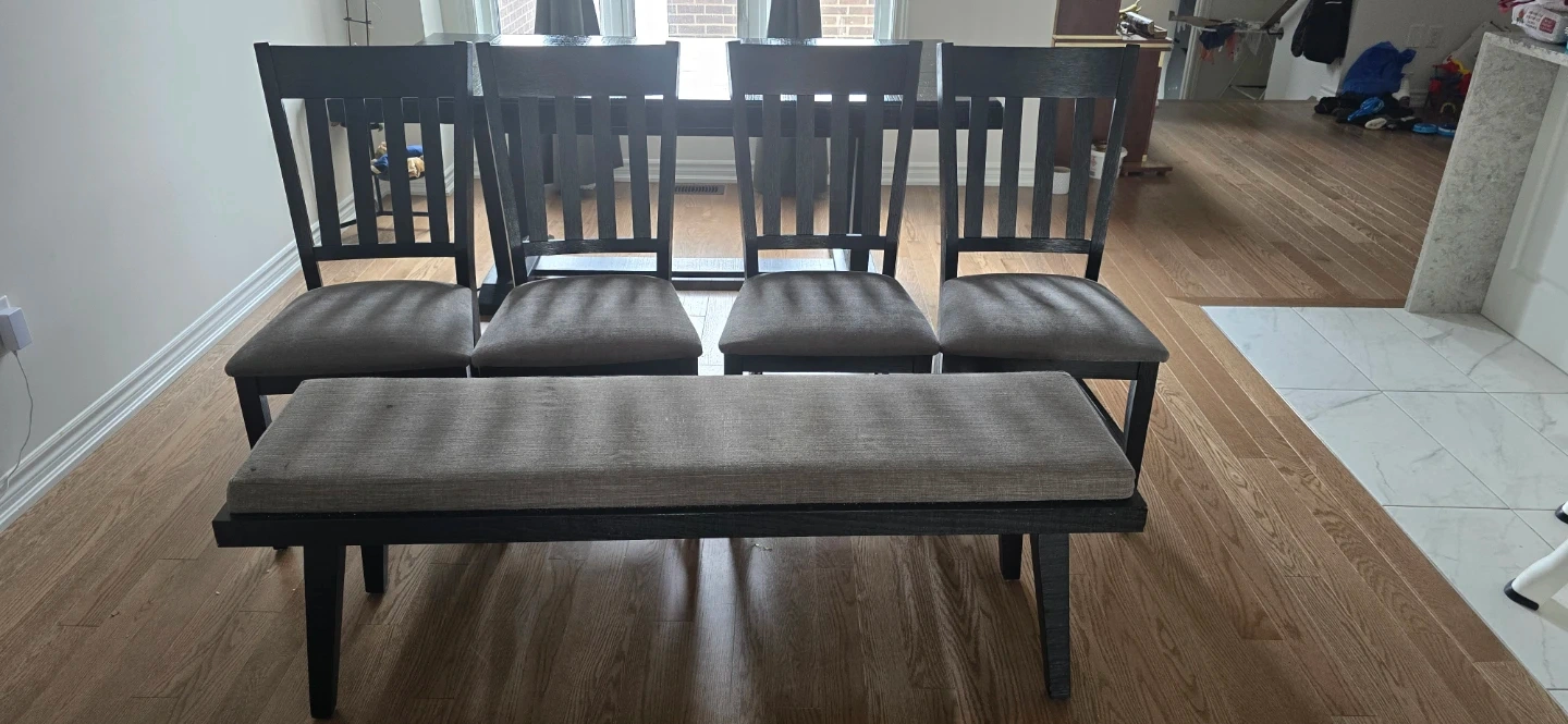 A stylish black dining table set featuring four chairs and a bench. The table has a dark wood finish with a planked top. Chairs and bench have grey upholstered seats. Seats up to six people comfortably. Slightly damaged support beam on one of the chairs. Otherwise everything is good.