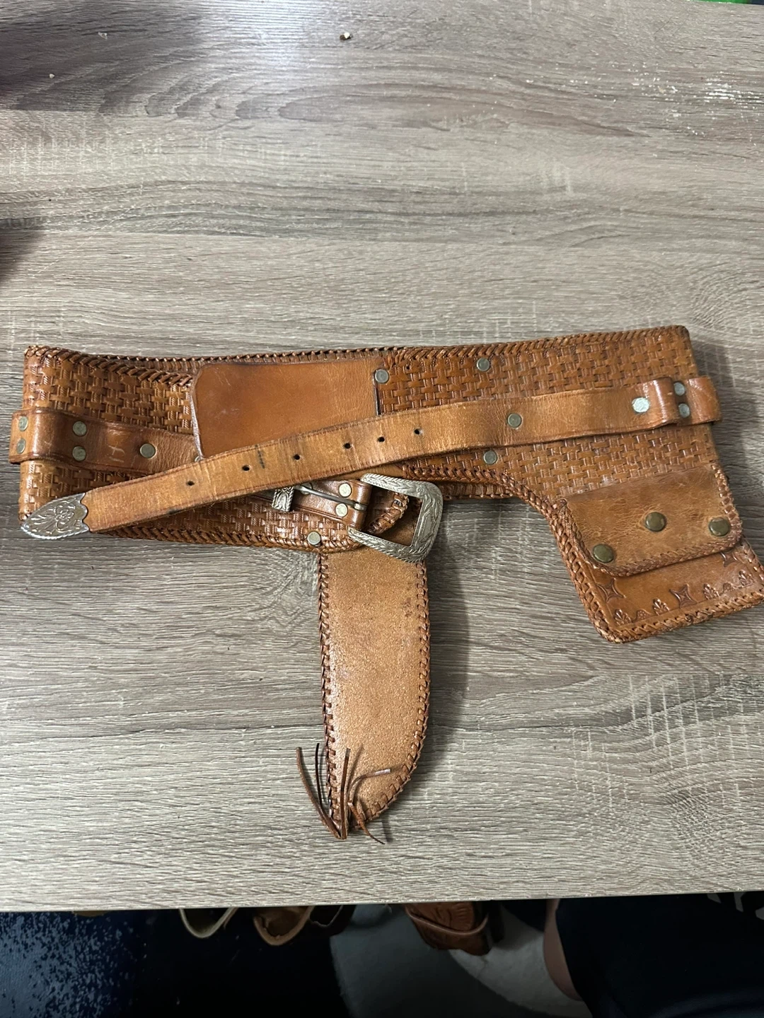 Vintage leather holster belt with a Western design. It features multiple loops for ammunition and a holster for a handgun. The leather is intricately tooled.