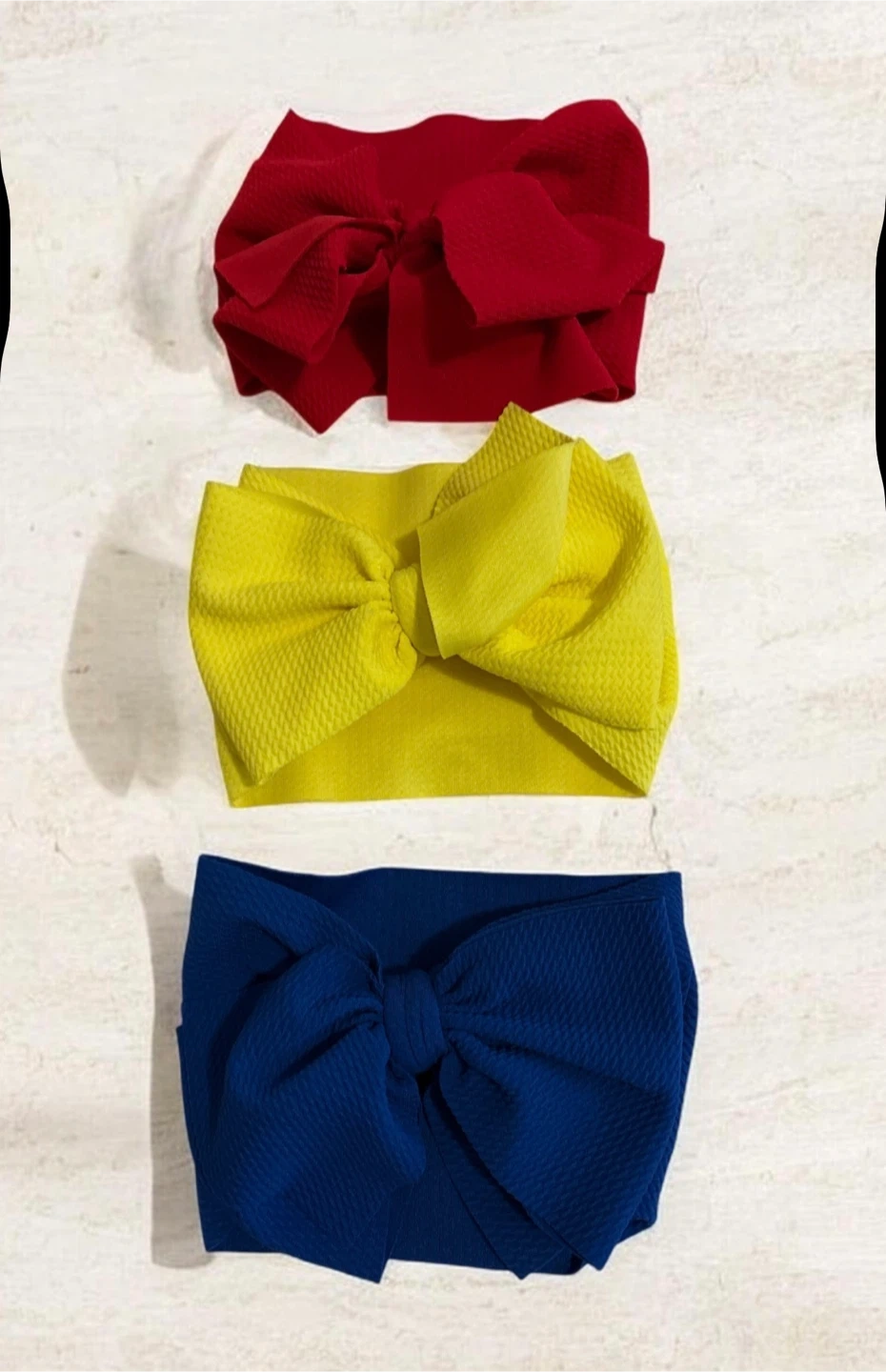 Set of three stretchy baby headbands with bows. Includes one red, one yellow, and one navy blue headband. They're made from a soft, textured fabric for comfort. Perfect for dressing up little ones!