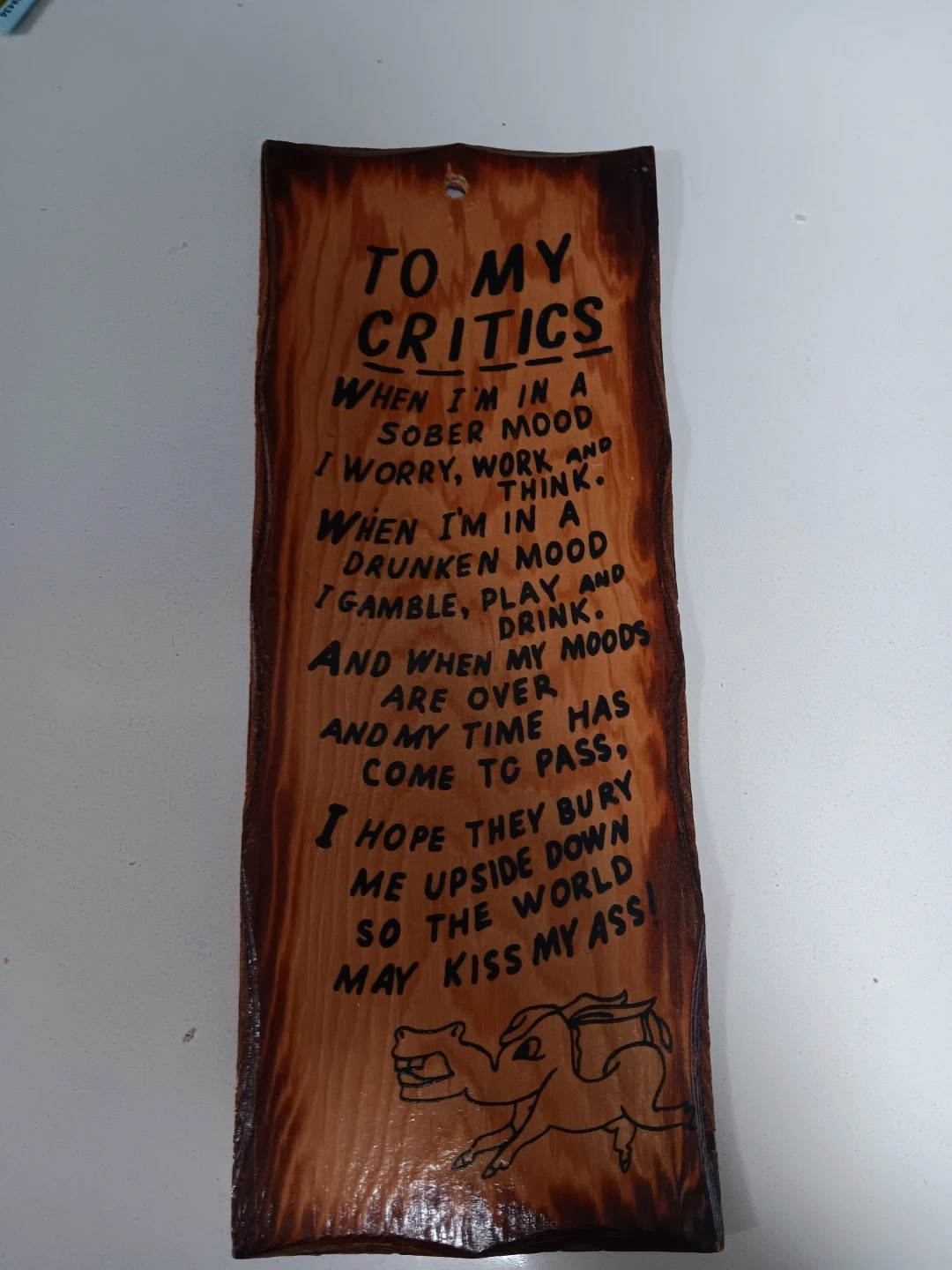 This wooden plaque features a humorous quote for your critics. It's made of wood with a burnt finish and a playful illustration. Hang it up as a conversation starter!
