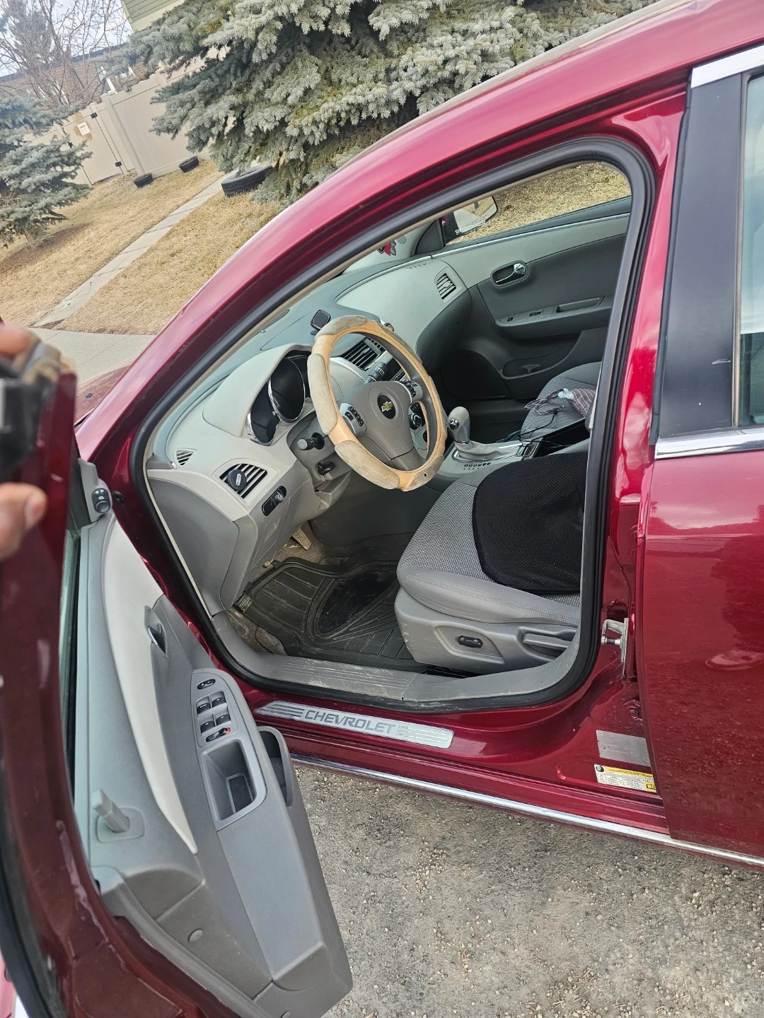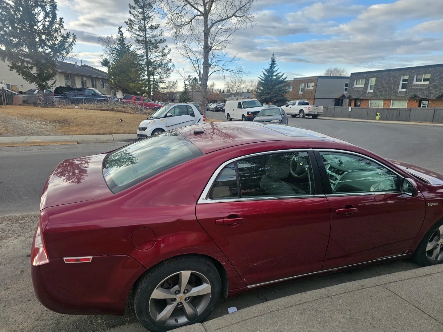 This is a 2010 Chevrolet Malibu Hybrid sedan. It's a four-door car with a red exterior. The interior is a light beige colour. Mileage and engine details are not provided.