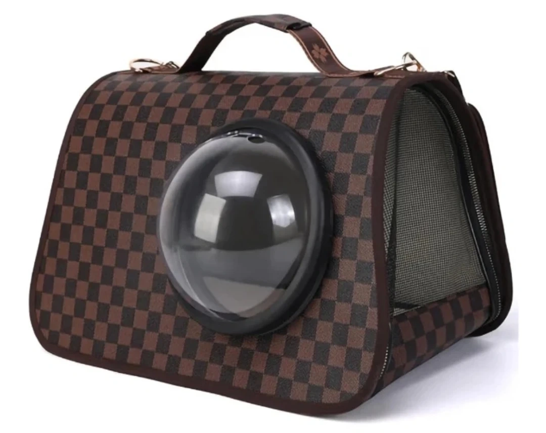 Brown checkered pet carrier with mesh sides and a transparent bubble window. It has a top handle and adjustable shoulder strap. Great for transporting small pets!