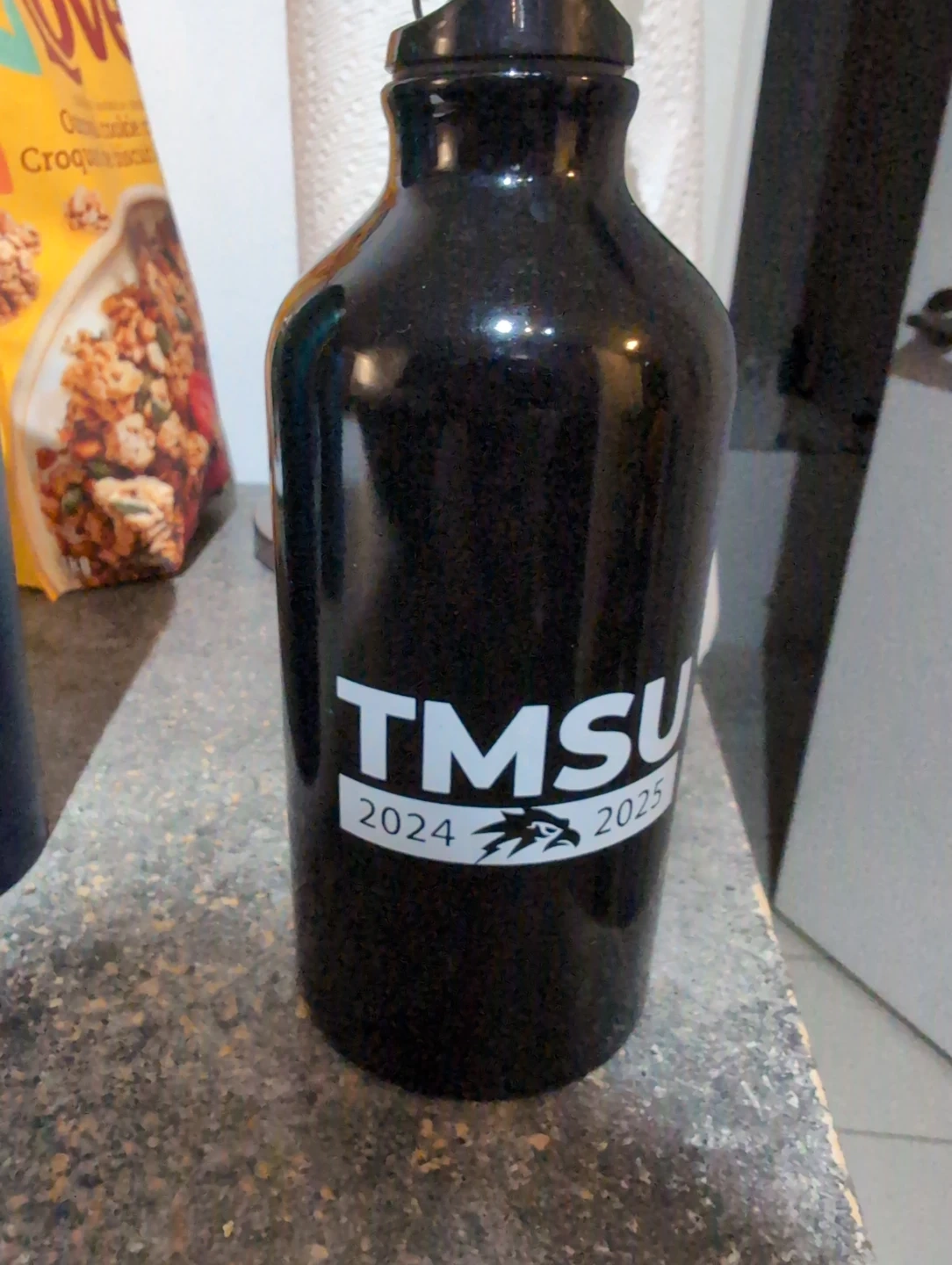 Black water bottle with TMSU and 2024-2025 markings. It's a reusable bottle made for hydration. Perfect for students!