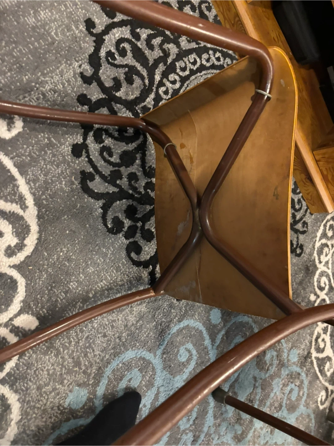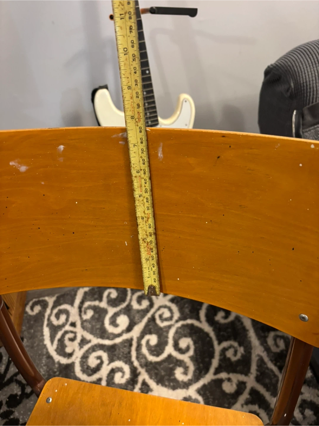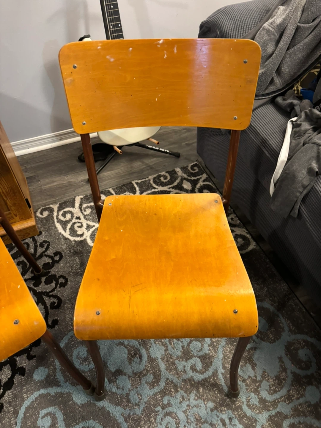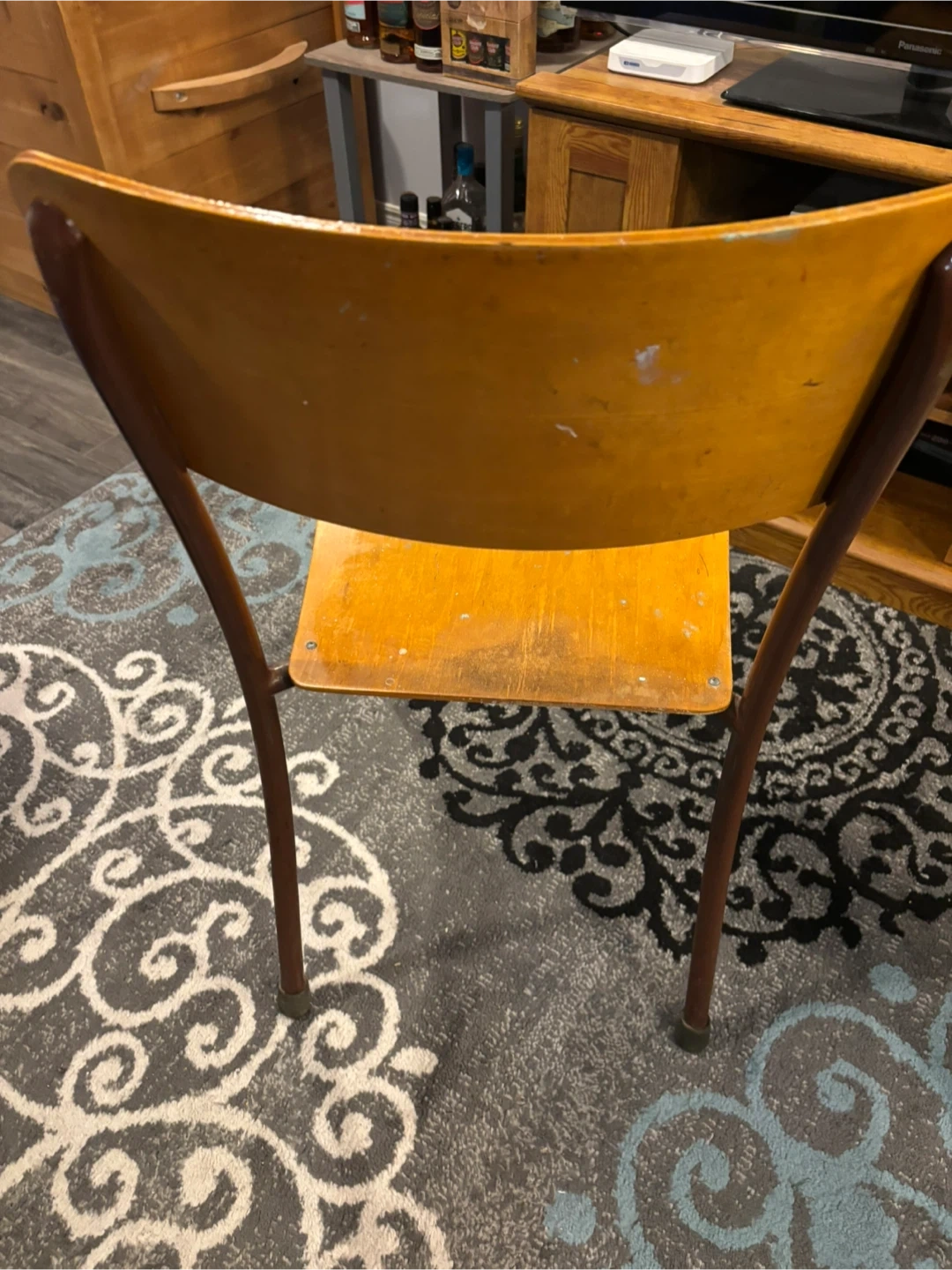 This is a classic wooden school chair with a metal frame. It has a golden brown wooden seat and back. These chairs are perfect for a retro-themed dining area or extra guest seating