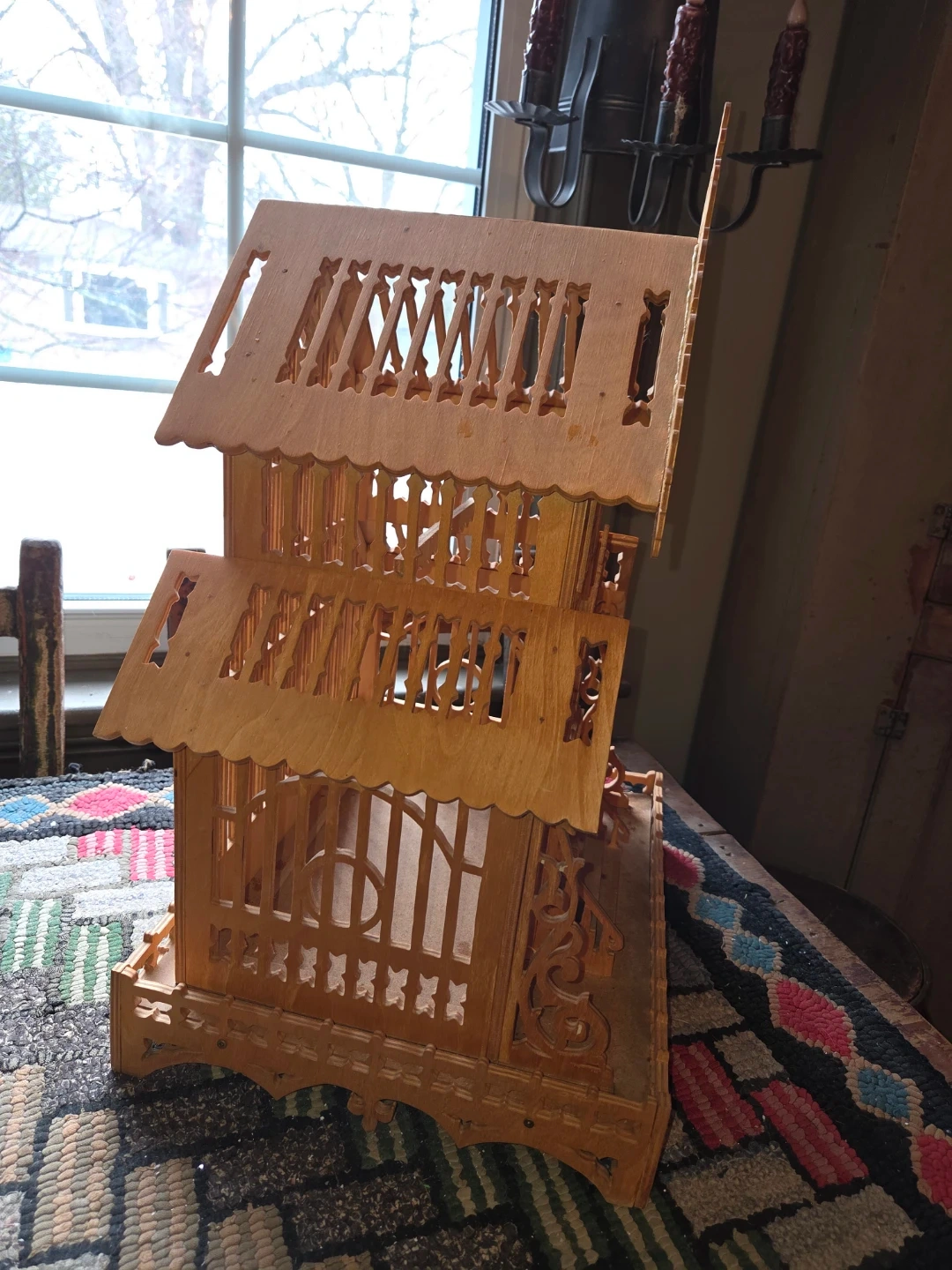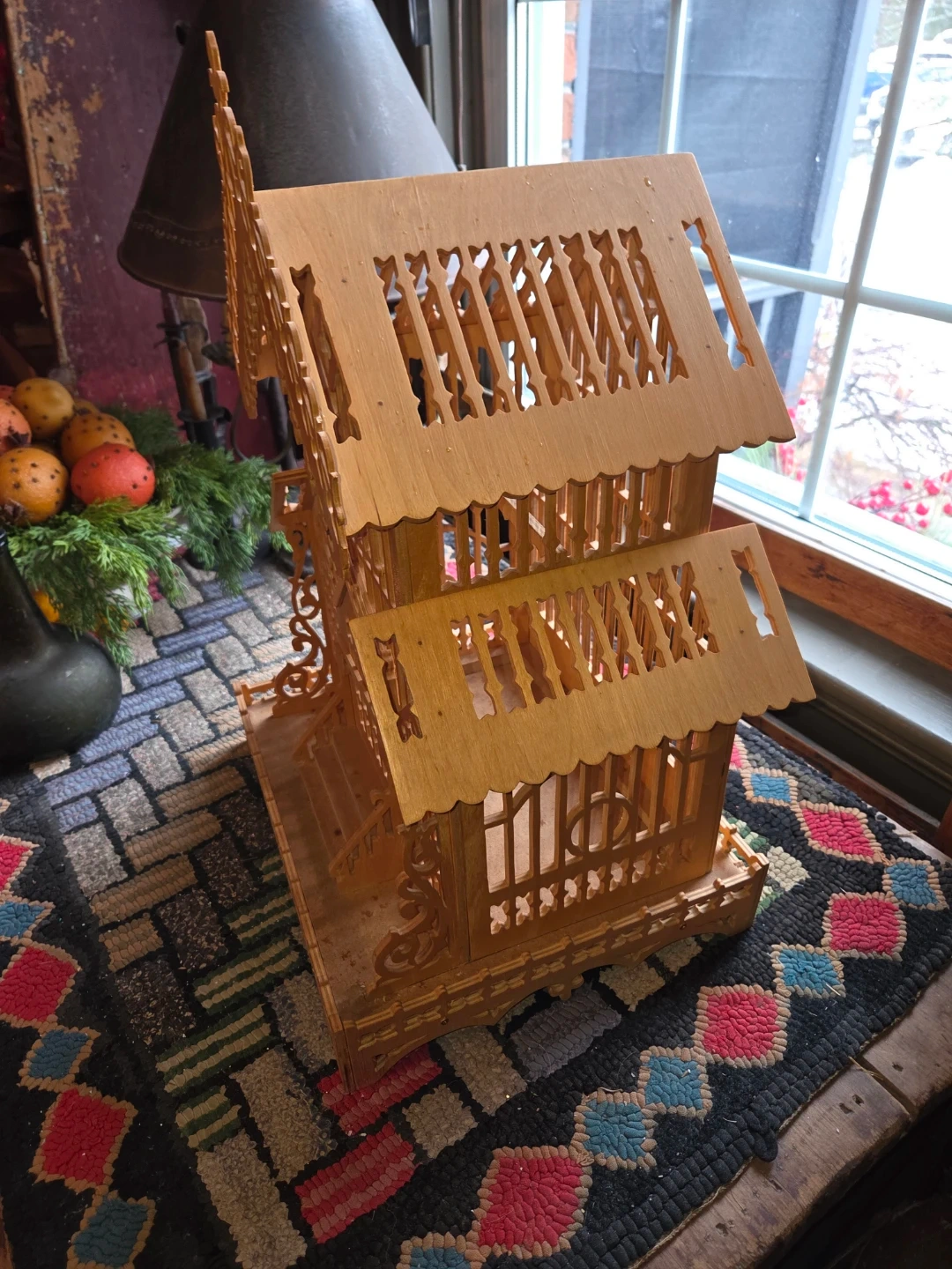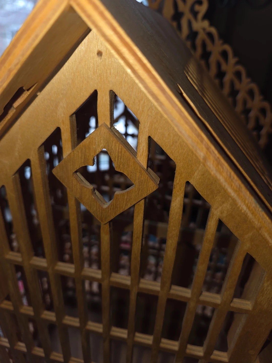 This is a decorative wooden bird cage with intricate fretwork details. It features a tiered roof design and ornate trim along the base. It's a charming piece for display or as a unique accent.