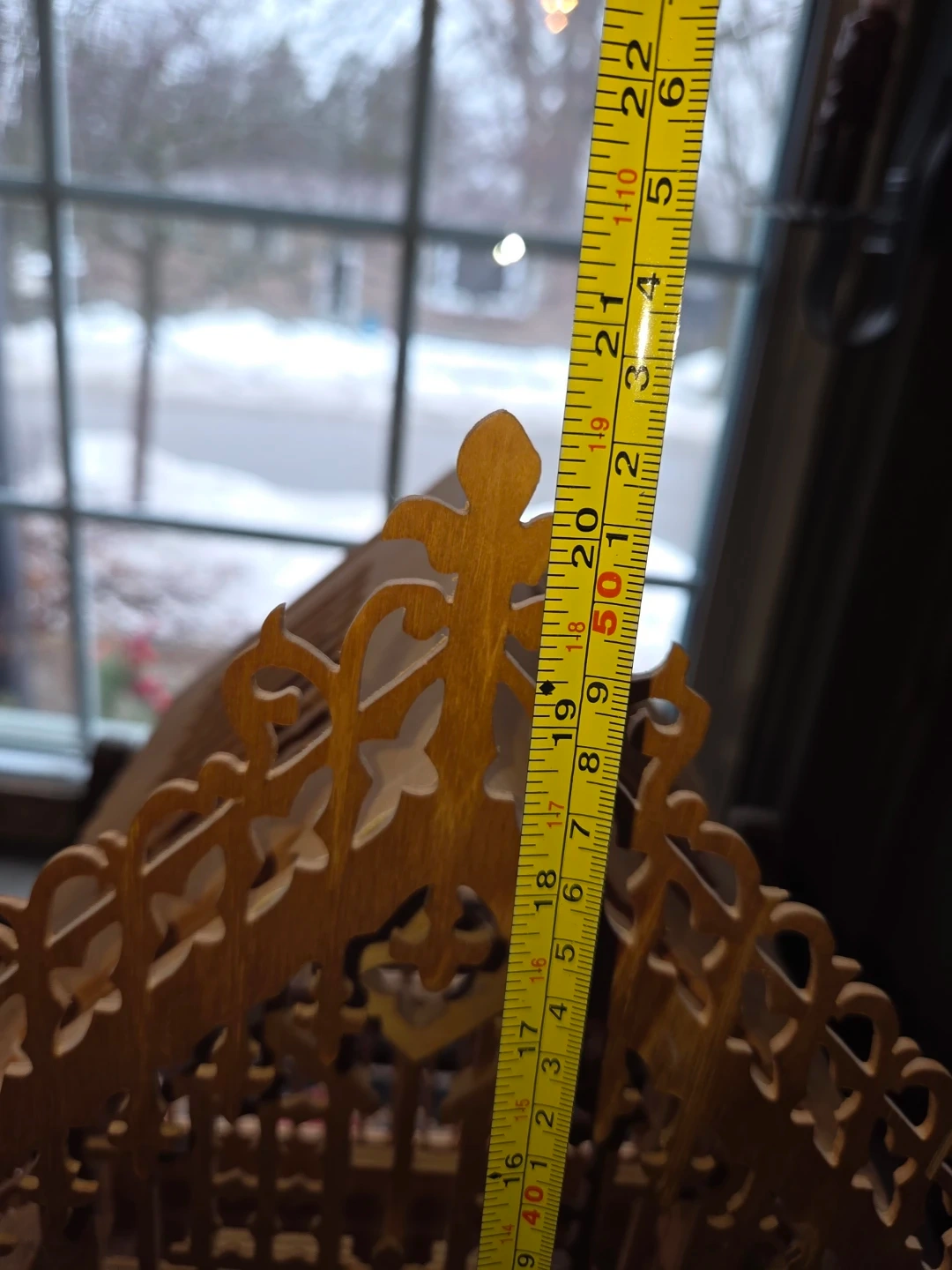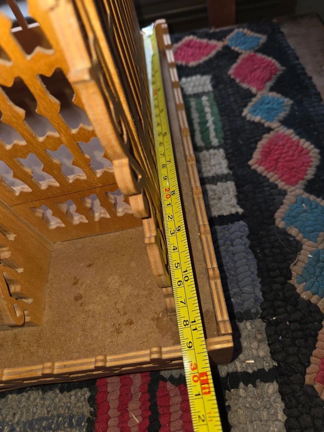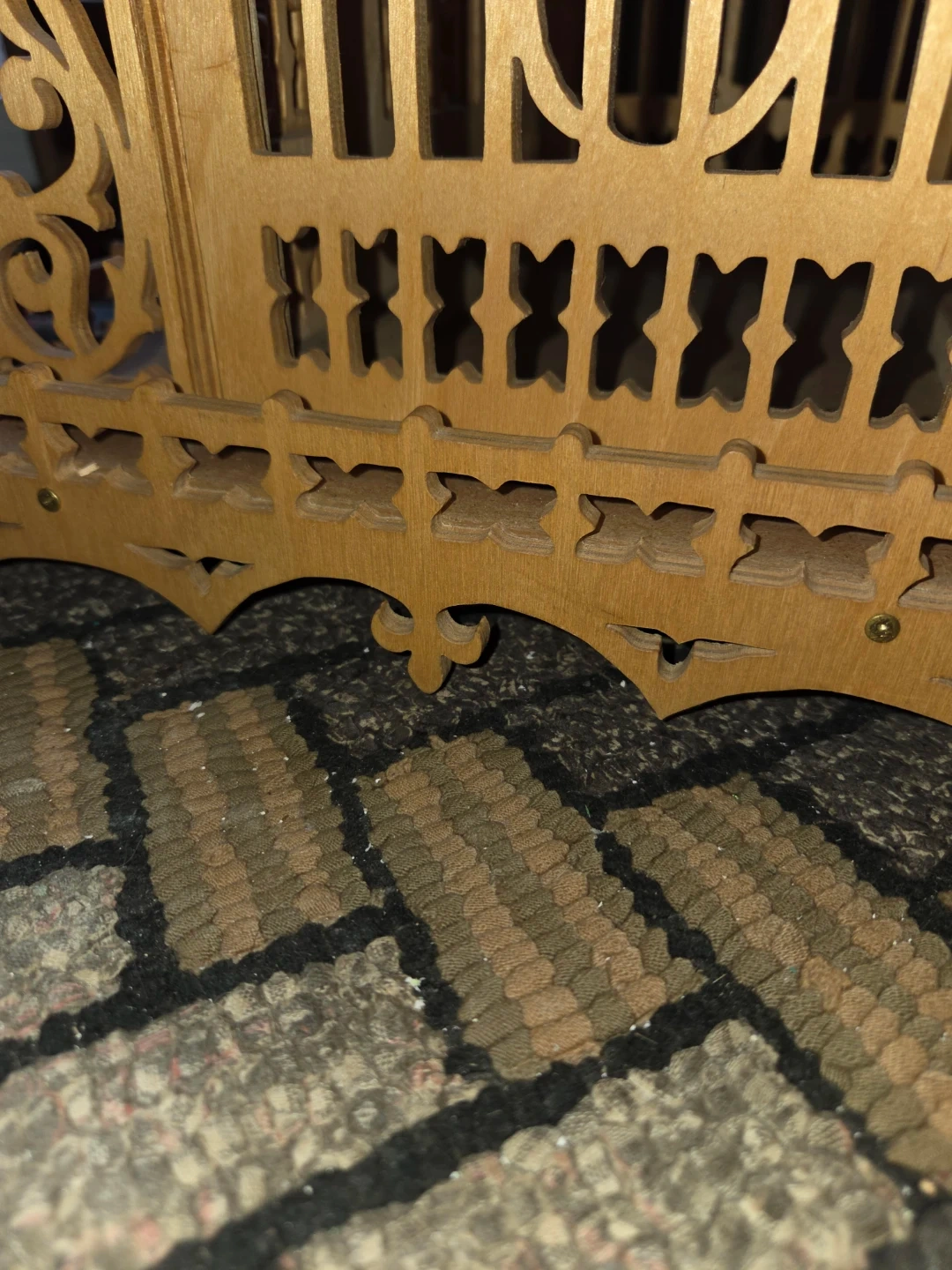 This is a decorative wooden bird cage with intricate fretwork details. It features a tiered roof design and ornate trim along the base. It's a charming piece for display or as a unique accent.