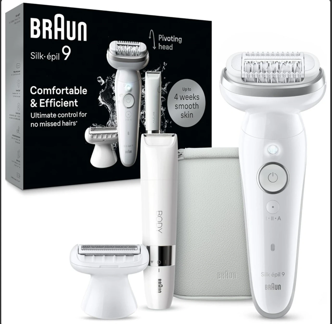 This Braun 9 epilator provides up to 4 weeks of smooth skin. It features a pivoting head for ultimate control. The set includes the epilator, an attachment, and a storage pouch.