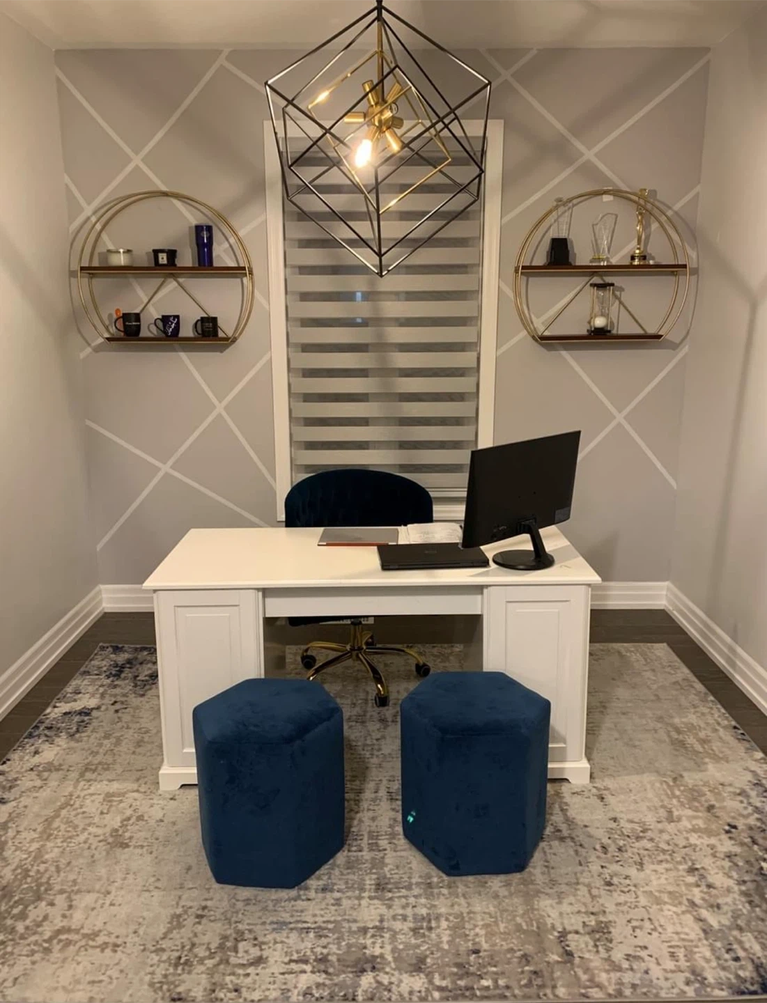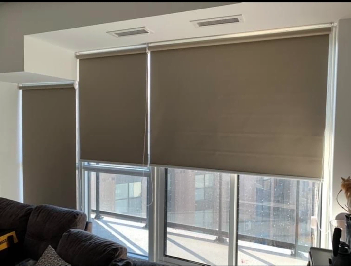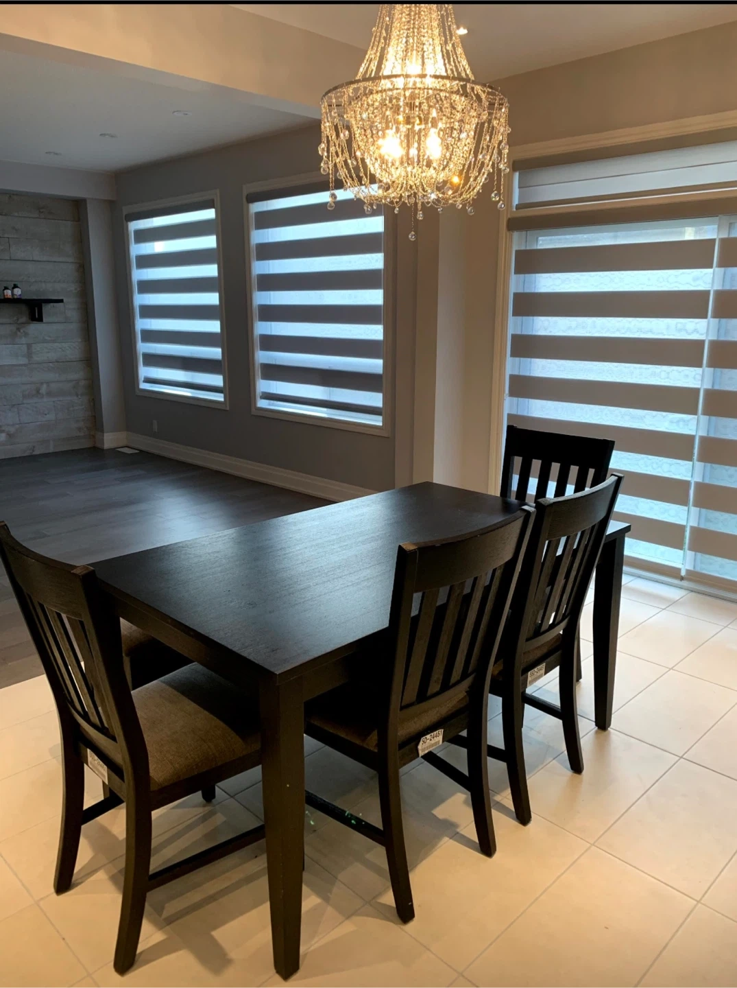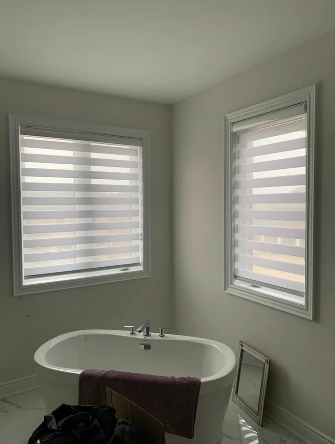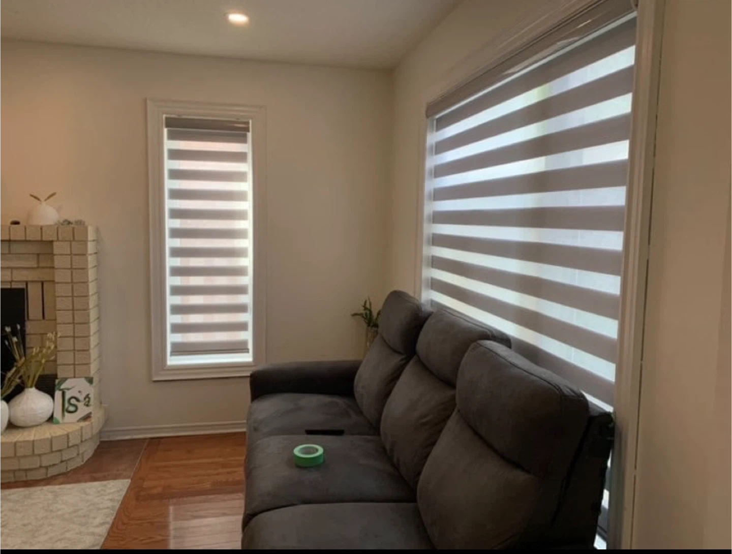 These brand new zebra blinds offer adjustable light control. They're a dual-layer window covering with alternating sheer and opaque stripes. Perfect for privacy and dimming natural light throughout the day!