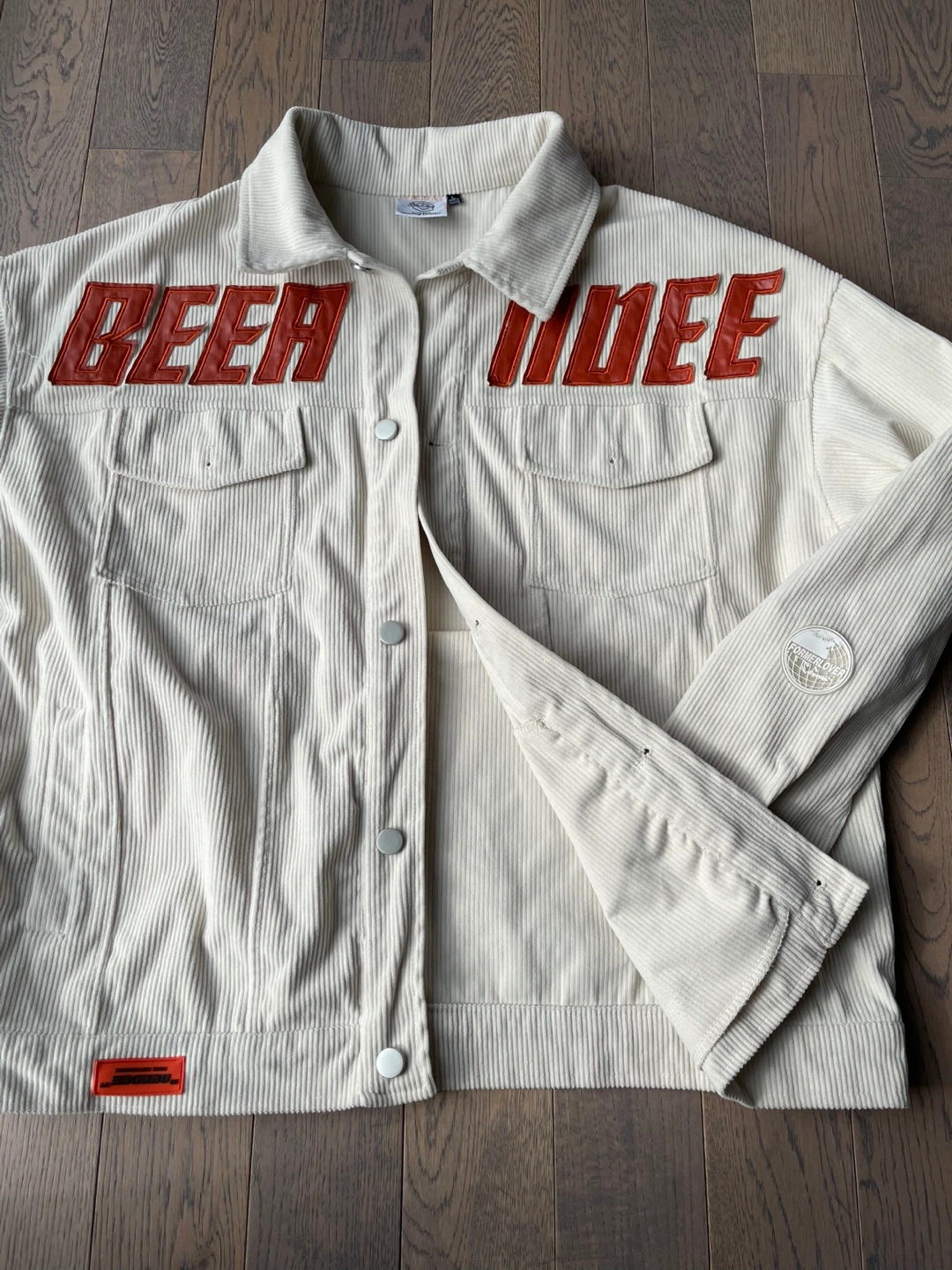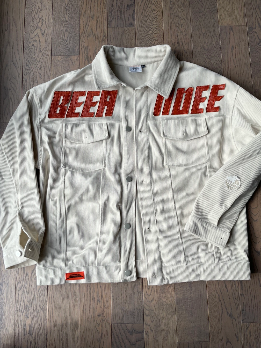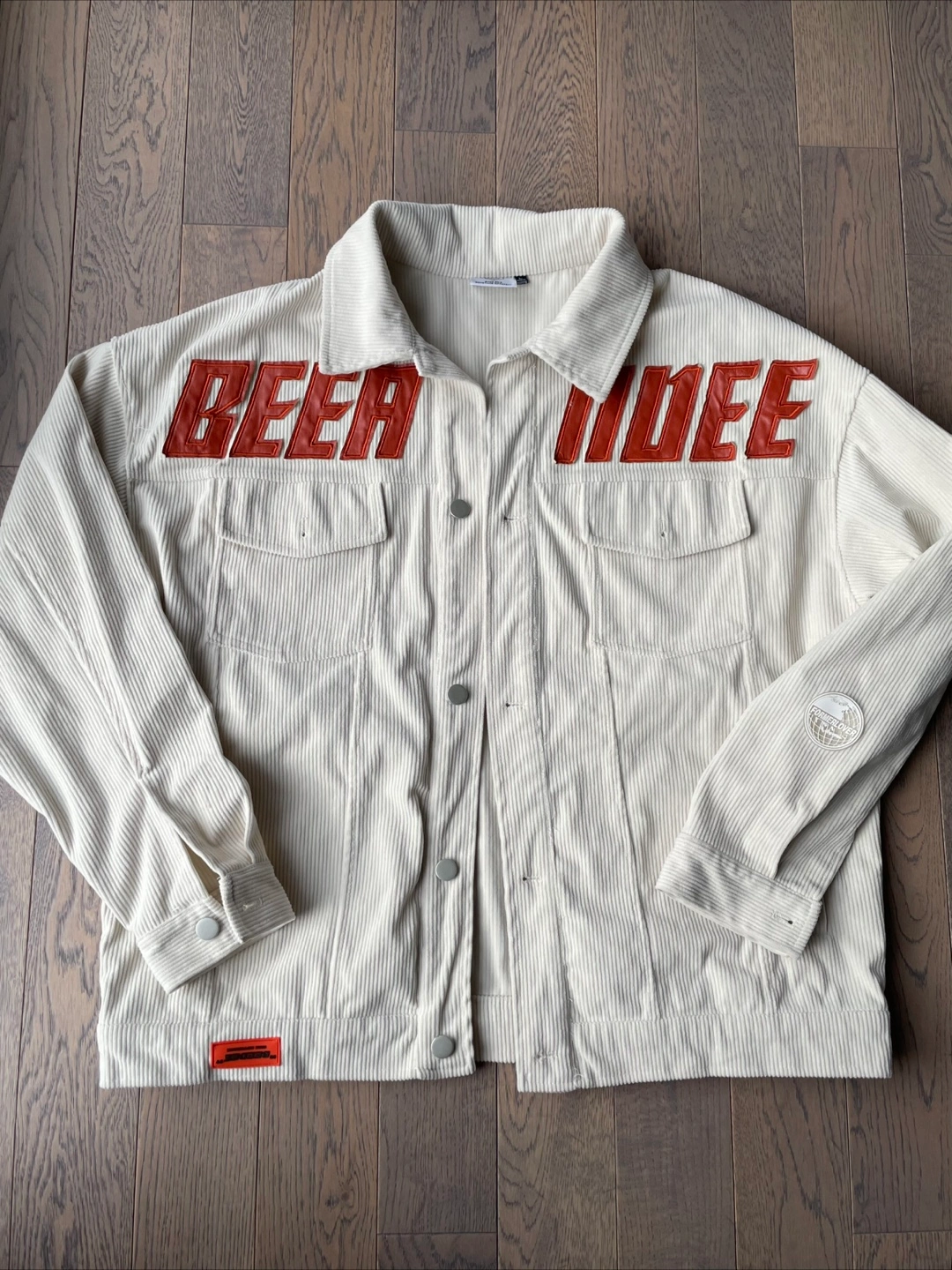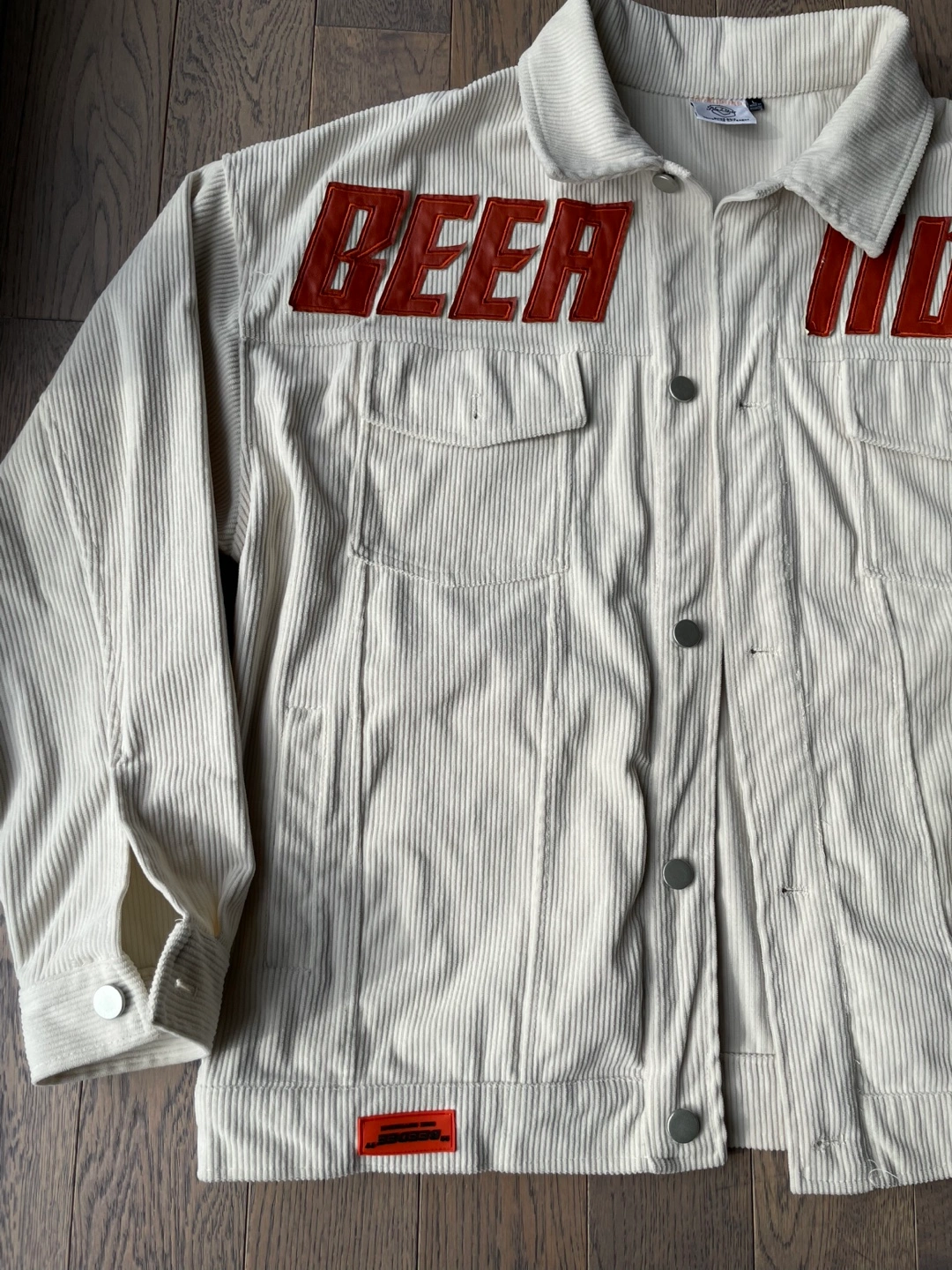 Cream coloured corduroy jacket with "BEER MODE" text graphic. It's a size large. Jacket has two chest pockets and button closures.