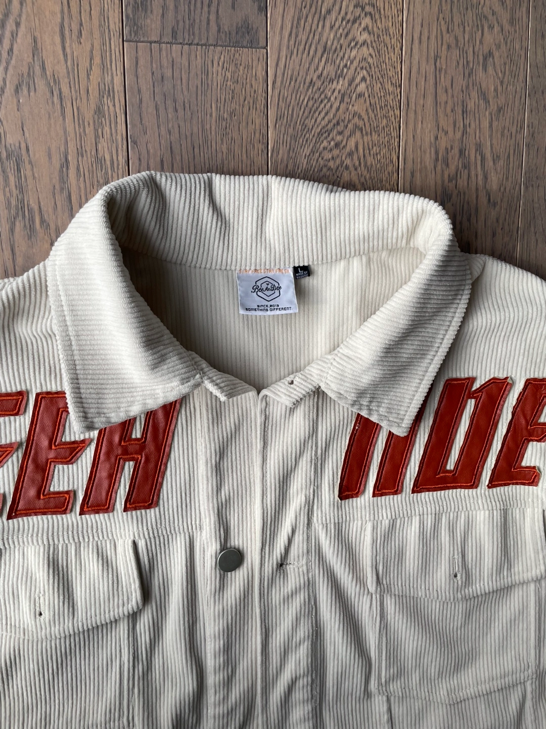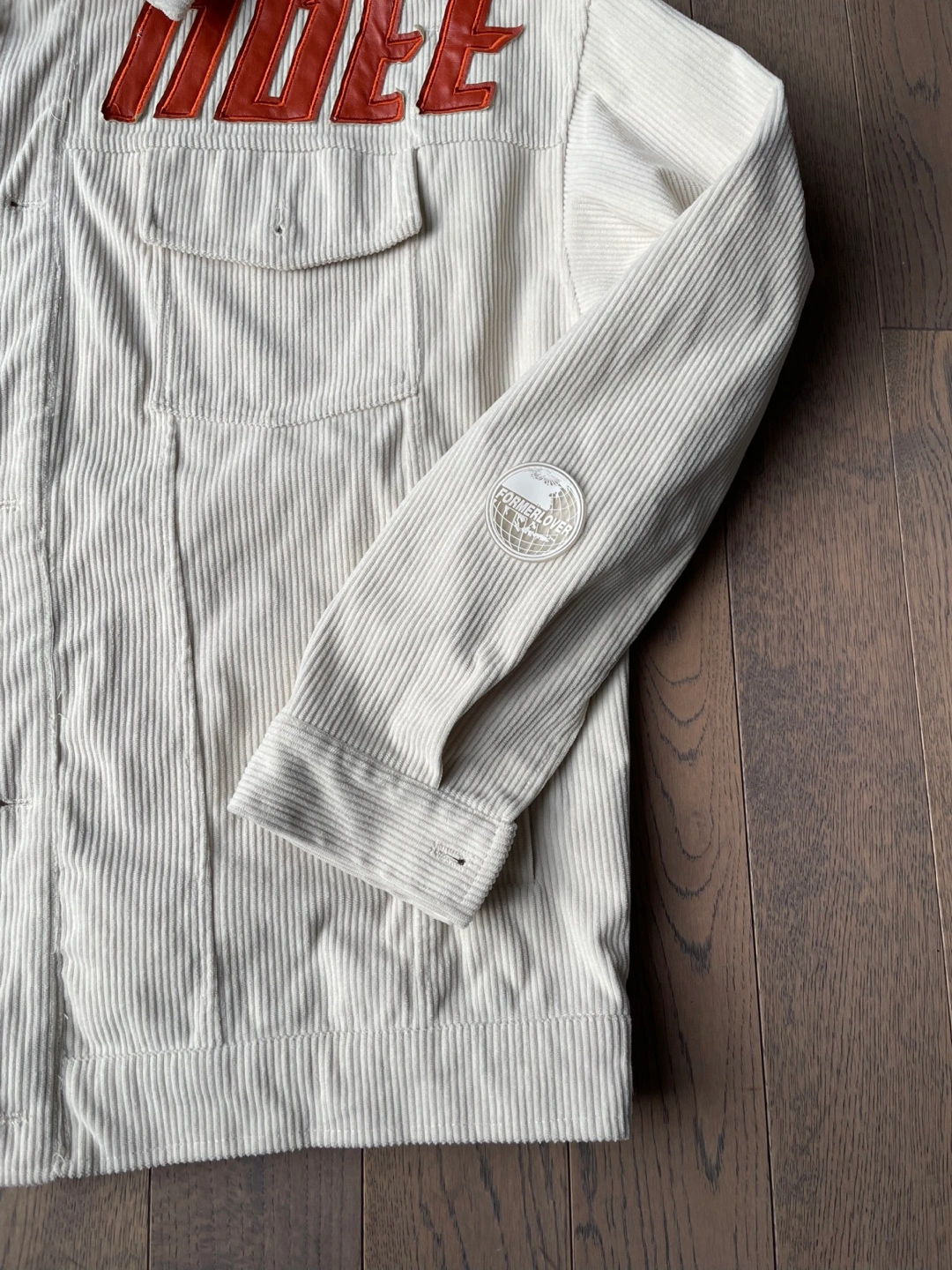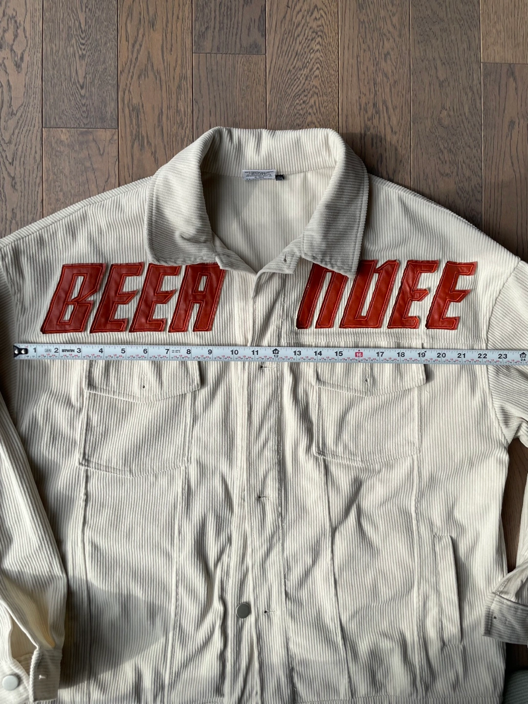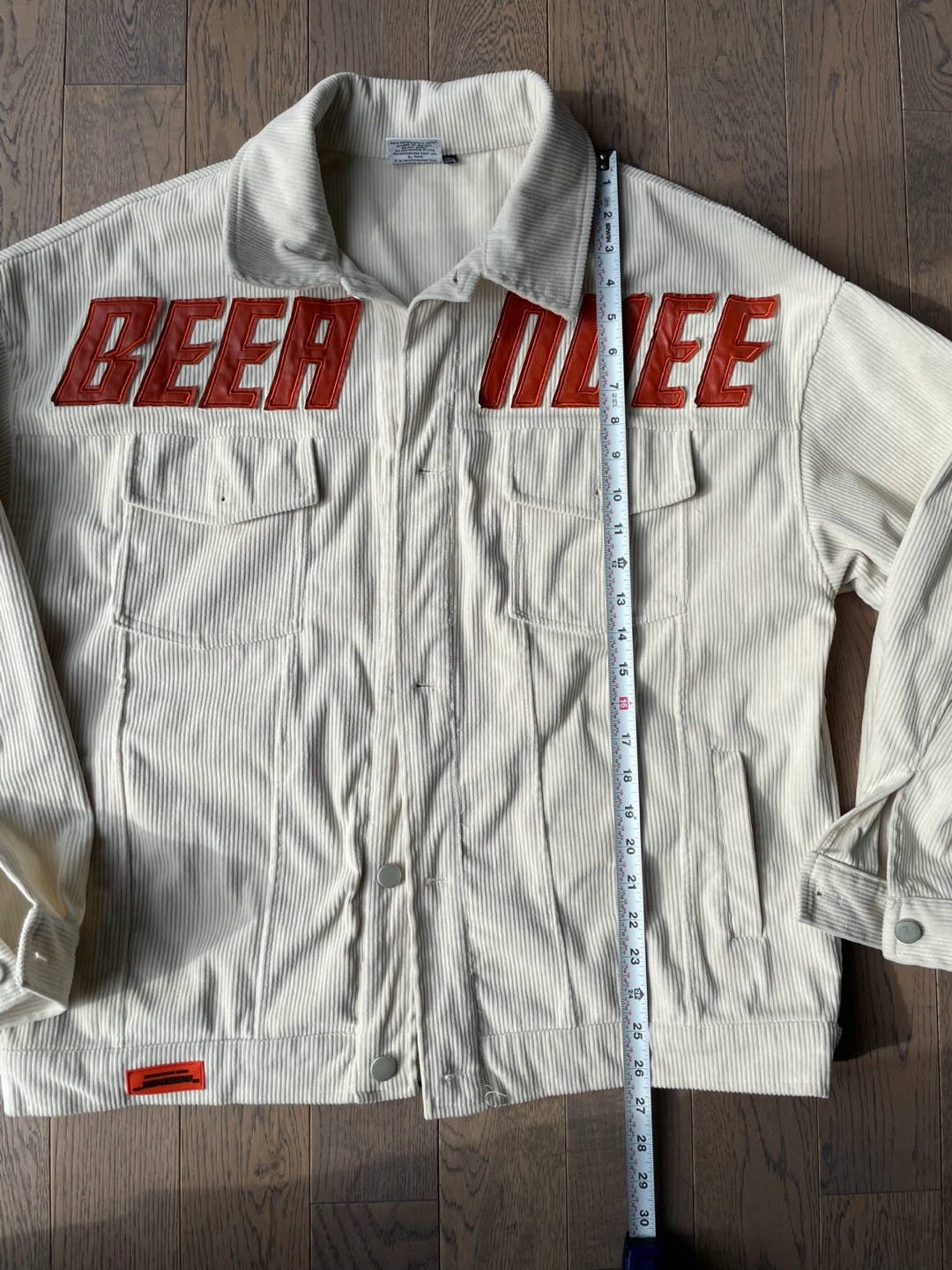 Cream coloured corduroy jacket with "BEER MODE" text graphic. It's a size large. Jacket has two chest pockets and button closures.