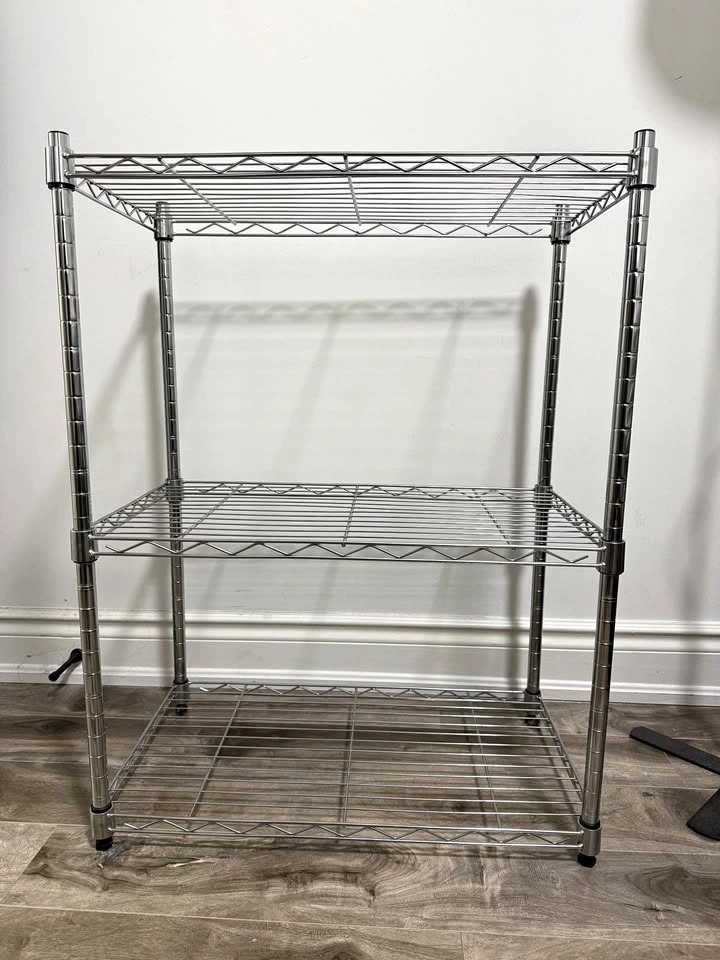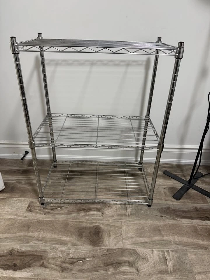 Selling a heavy-duty metal wire shelving rack in very good condition. Perfect for storage, kitchen, pantry, garage, laundry room, or closet use. Strong, stable, and space-efficient. Features: Durable chrome / stainless steel metal finish, 3-tier wire shelves, very sturdy construction, adjustable shelf height, easy to assemble / disassemble. Clean and well maintained with no rust or damage. Great for organizing boxes, appliances, groceries, tools, or supplies. From a smoke-free home. Pickup only. Price is negotiable for quick pickup.