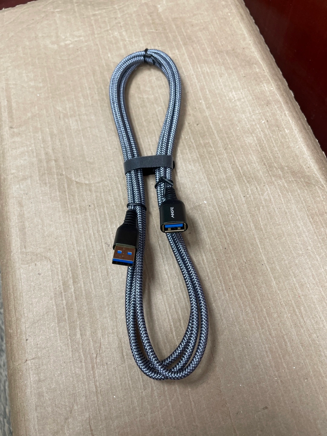 Anker USB-A to USB-A 3.0 extension cable. Features a braided nylon design for durability. It's black and grey. Useful for extending the reach of USB devices.
