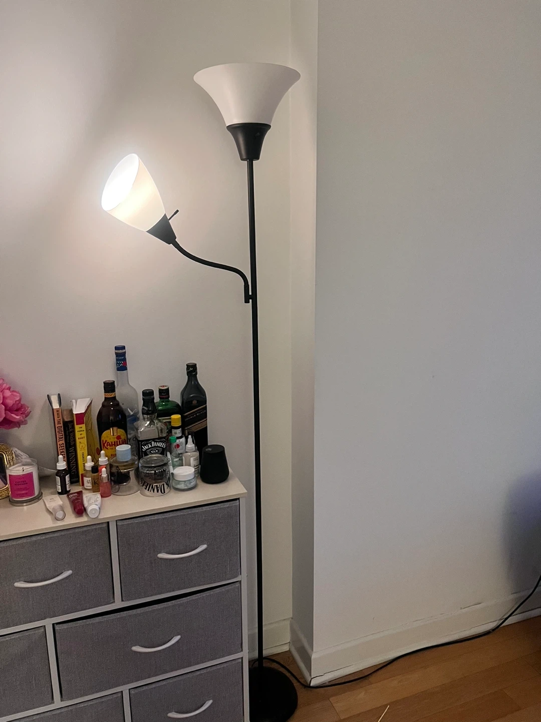This floor lamp has two lights, one for general illumination and a flexible reading light. It's black with white shades and stands tall to light up a room. Perfect for reading or adding ambient light to your space!