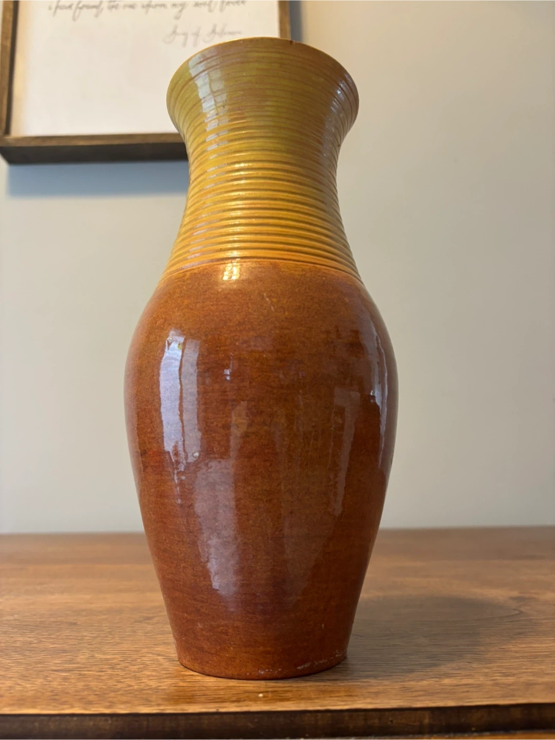 A beautiful vase with a glossy, ombre glaze. It features a ribbed texture around the neck and a smooth, bulbous body. This vase is perfect for displaying fresh flowers or as a standalone decorative piece. 11” tall. Cash only.