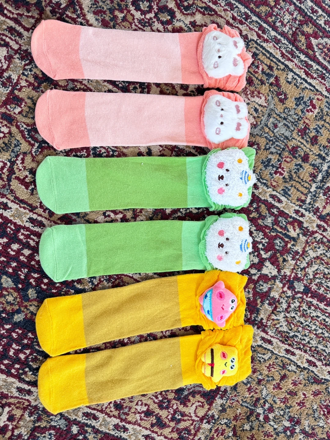 3 pairs of cute fuzzy socks for kids. They feature adorable animal faces with 3D ears and are made of soft, stretchy material. Includes three pairs in pink/peach, two pairs in green, and two pairs in yellow. Perfect for keeping little feet cozy!