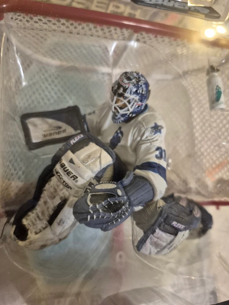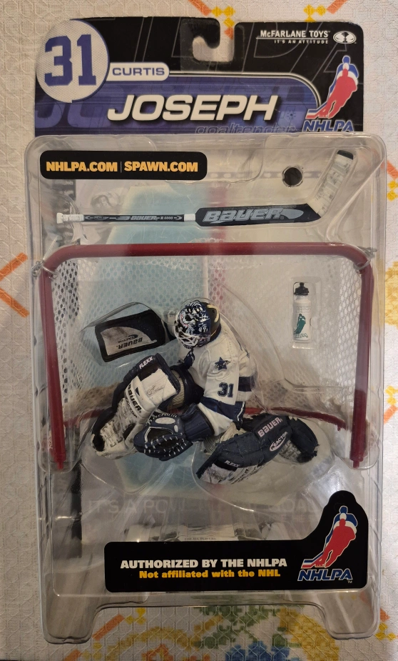 New in package. Curtis Joseph collectible figure. Includes goalie equipment and net. Part of the McFarlane Sportspicks series. Officially authorized by the NHLPA.