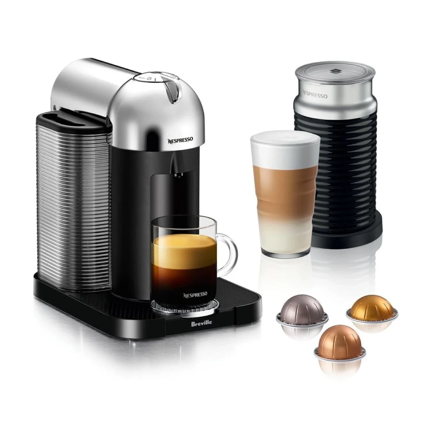 with BREVILLE Aeroccino Milk Frother, Chrome Brew single-serve coffee and espresso with this Nespresso VertuoPlus machine. It features Centrifusion technology for smooth extraction. Aeroccino milk frother for lattes and cappuccinos. Nespresso Vertuo Coffee and Espresso Machine by Breville with Aeroccino Milk Frother, and FREE Coffee Capsule Filter