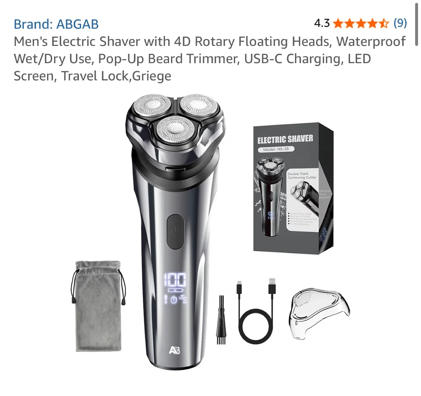 This ABGAB electric shaver features 4D rotary floating heads and a pop-up beard trimmer. It offers waterproof wet/dry use and USB-C charging with an LED screen. Includes a travel lock, charging cable, cleaning brush, and travel pouch.