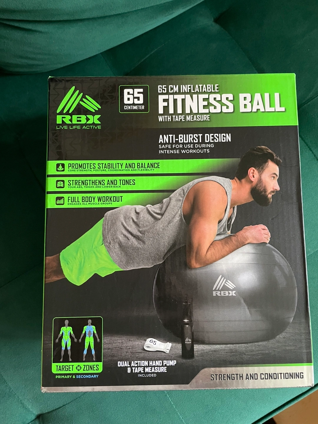 Inflatable fitness ball with pump and tape measure. Anti-burst design. Cash only please and pick up at keele subway station