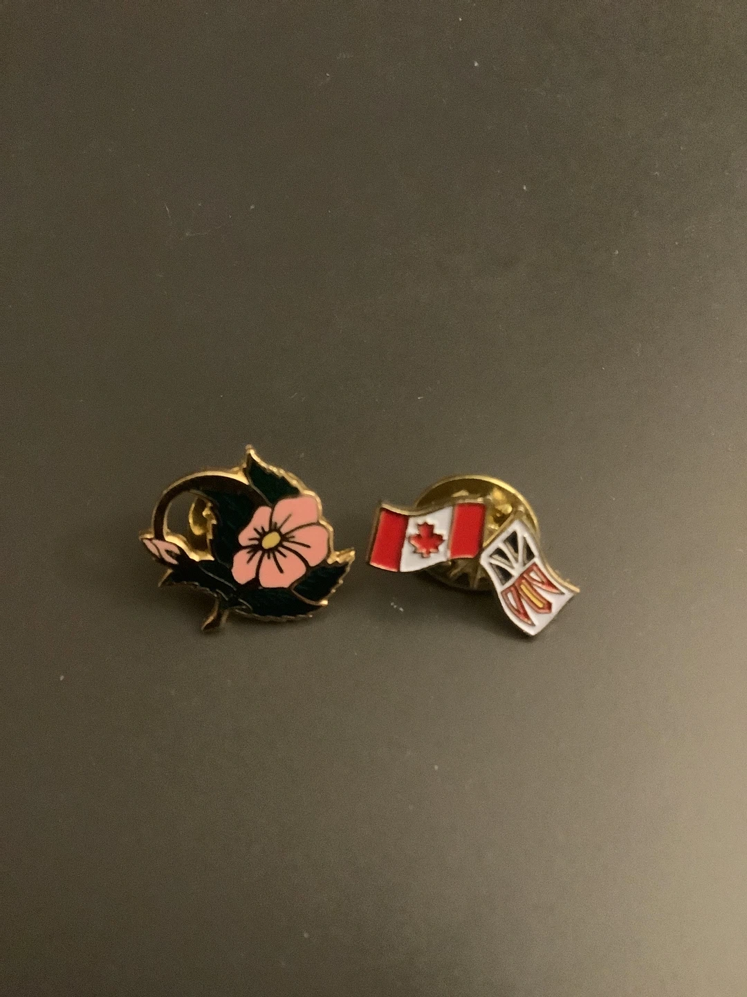 Wild rose and Newfoundland+Canada flag pins 🥕