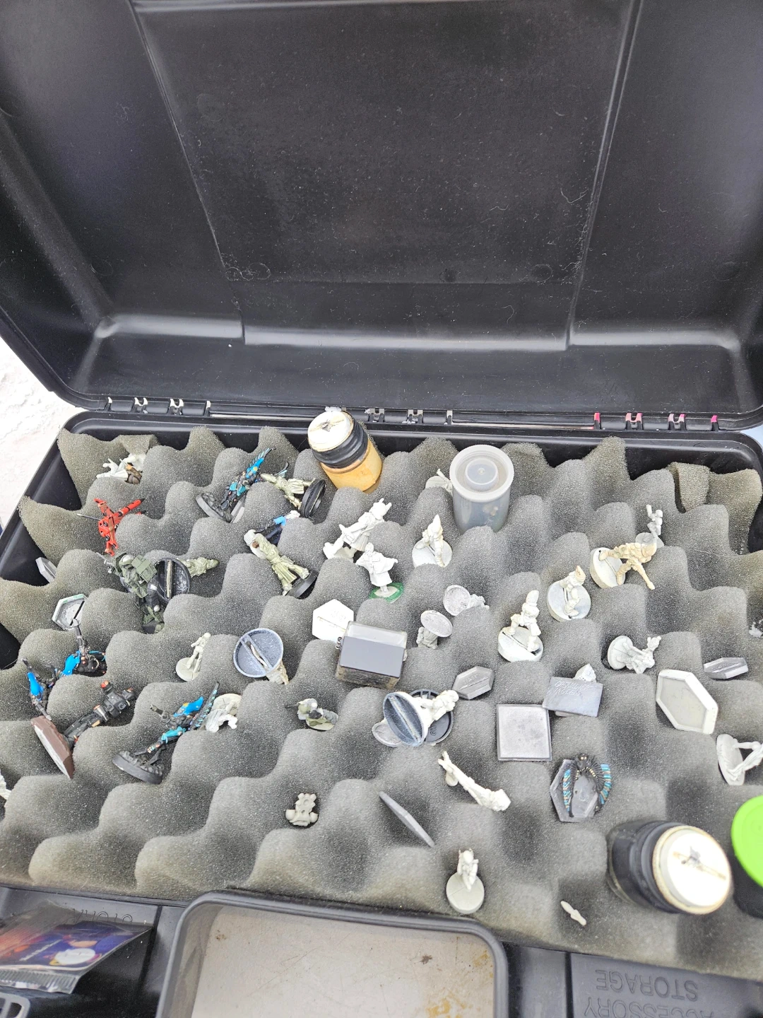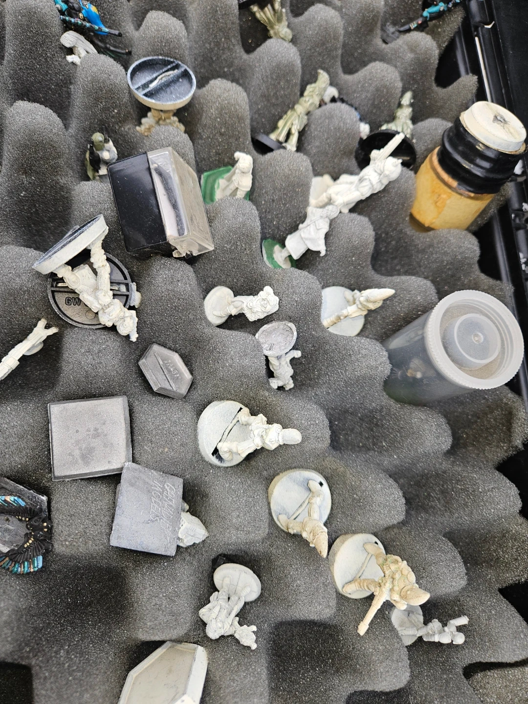 Collection of various unassembled and unpainted miniature figures. Includes a black foam-lined carrying case. Figures appear to be made of metal and plastic. Case dimensions are approximately 15x10x4 inches. Perfect for tabletop gaming enthusiasts or hobbyists!